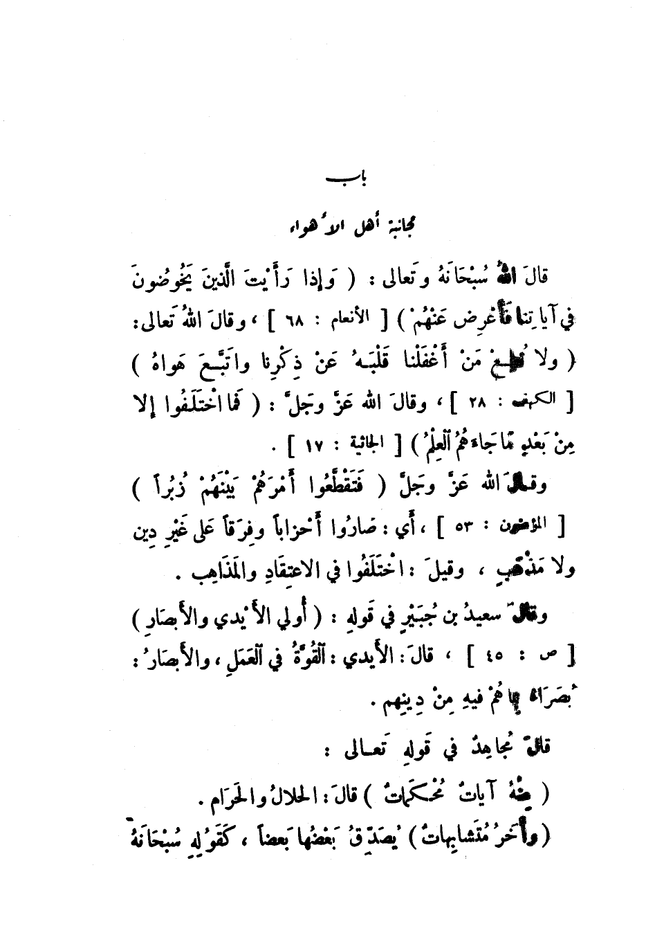 قَالَ اللَّهُ سُبْحَانَهُ وَتَعَالَى: {وَإِذَا رَأَيْتَ الَّذِينَ يَخُوضُونَ فِي آيَاتِنَا فَأَعْرِضْ عَنْهُمْ} [الْأَنْعَام: 68]، وَقَالَ اللَّهُ تَعَالَى: {وَلا تُطِعْ مَنْ أَغْفَلْنَا قَلْبَهُ عَنْ ذِكْرِنَا وَاتَّبَعَ هَوَاهُ} [الْكَهْف: 28]، وَقَالَ اللَّهُ عَزَّ وَجَلَّ: {فَمَا اخْتَلَفُوا إِلا مِنْ بَعْدِ مَا جَاءَهُمُ الْعِلْمُ} [الجاثية: 17]، وَقَالَ اللَّهُ عَزَّ وَجَلَّ: {فَتَقَطَّعُوا أَمْرَهُمْ بَيْنَهُمْ زُبُرًا} [الْمُؤْمِنُونَ: 53]، أَيْ: صَارُوا أَحْزَابًا وَفِرَقًا عَلَى غَيْرِ دِينٍ وَلا مَذْهَبٍ، وَقِيلَ: اخْتَلَفُوا فِي الاعْتِقَادِ وَالْمَذَاهِبِ.