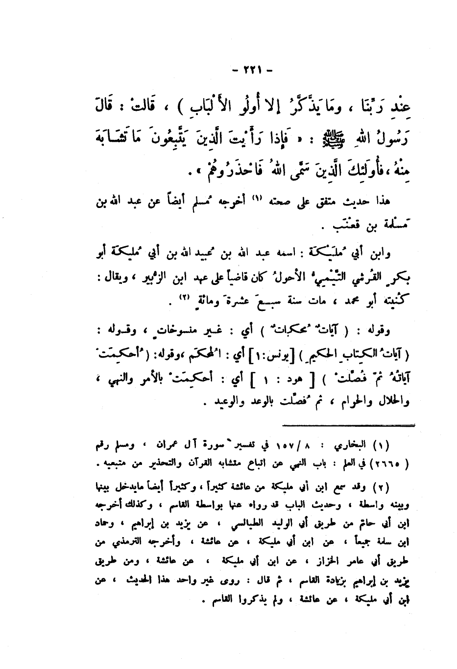 عِنْدِ رَبِّنَا وَمَا يَذَّكَّرُ إِلا أُولُو الأَلْبَابِ} [آل عمرَان: 7]، قَالَتْ: قَالَ رَسُولُ اللَّهِ صَلَّى اللهُ عَلَيْهِ وَسَلَّمَ: «فَإِذَا رَأَيْتَ الَّذِينَ يَتَّبِعُونَ مَا تَشَابَهَ مِنْهُ، فَأُولَئِكَ الَّذِينَ سَمَّى اللَّهُ فَاحْذَرُوهُمْ».