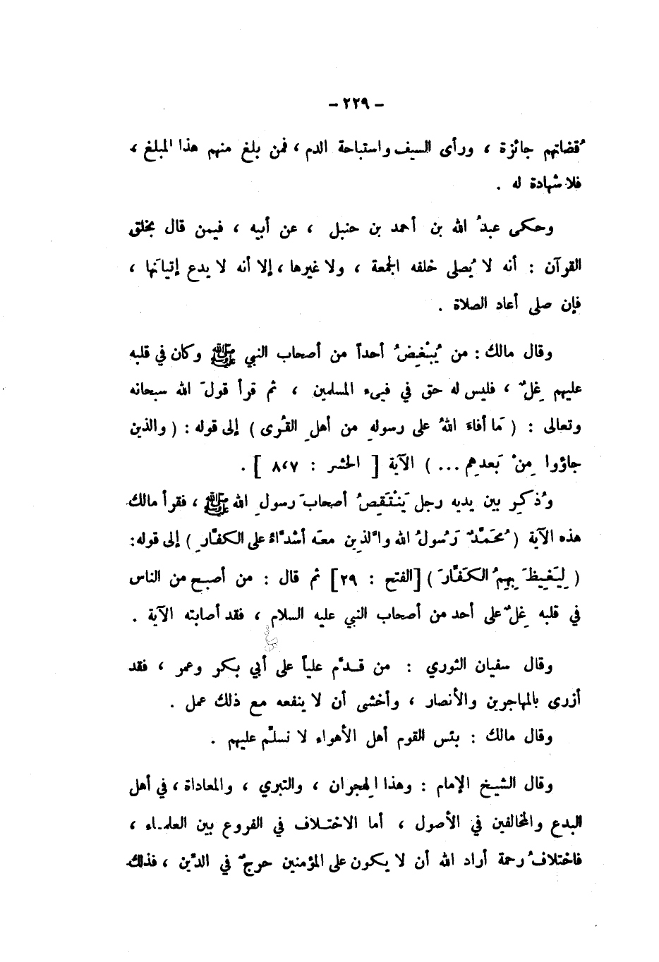 وَذُكِرَ بَيْنَ يَدَيْهِ رَجُلٌ يَنْتَقِصُ أَصْحَابَ رَسُولِ اللَّهِ صَلَّى اللَّهُ عَلَيْهِ وَسَلَمَّ، فَقَرَأَ مَالِكٌ هَذِهِ الآيَةَ: {مُحَمَّدٌ رَسُولُ اللَّهِ وَالَّذِينَ مَعَهُ أَشِدَّاءُ عَلَى الْكُفَّارِ إِلَى قَوْلِهِ لِيَغِيظَ بِهِمُ الْكُفَّارَ} [الْفَتْح: 29] ثُمَّ قَالَ: مَنْ أَصْبَحَ مِنَ النَّاسِ فِي قَلْبِهِ غِلٌّ عَلَى أَحَدٍ مِنْ أَصْحَابِ النَّبِيِّ صَلَّى اللهُ عَلَيْهِ وَسَلَّمَ، فَقَدْ أَصَابَتْهُ الآيَةُ.