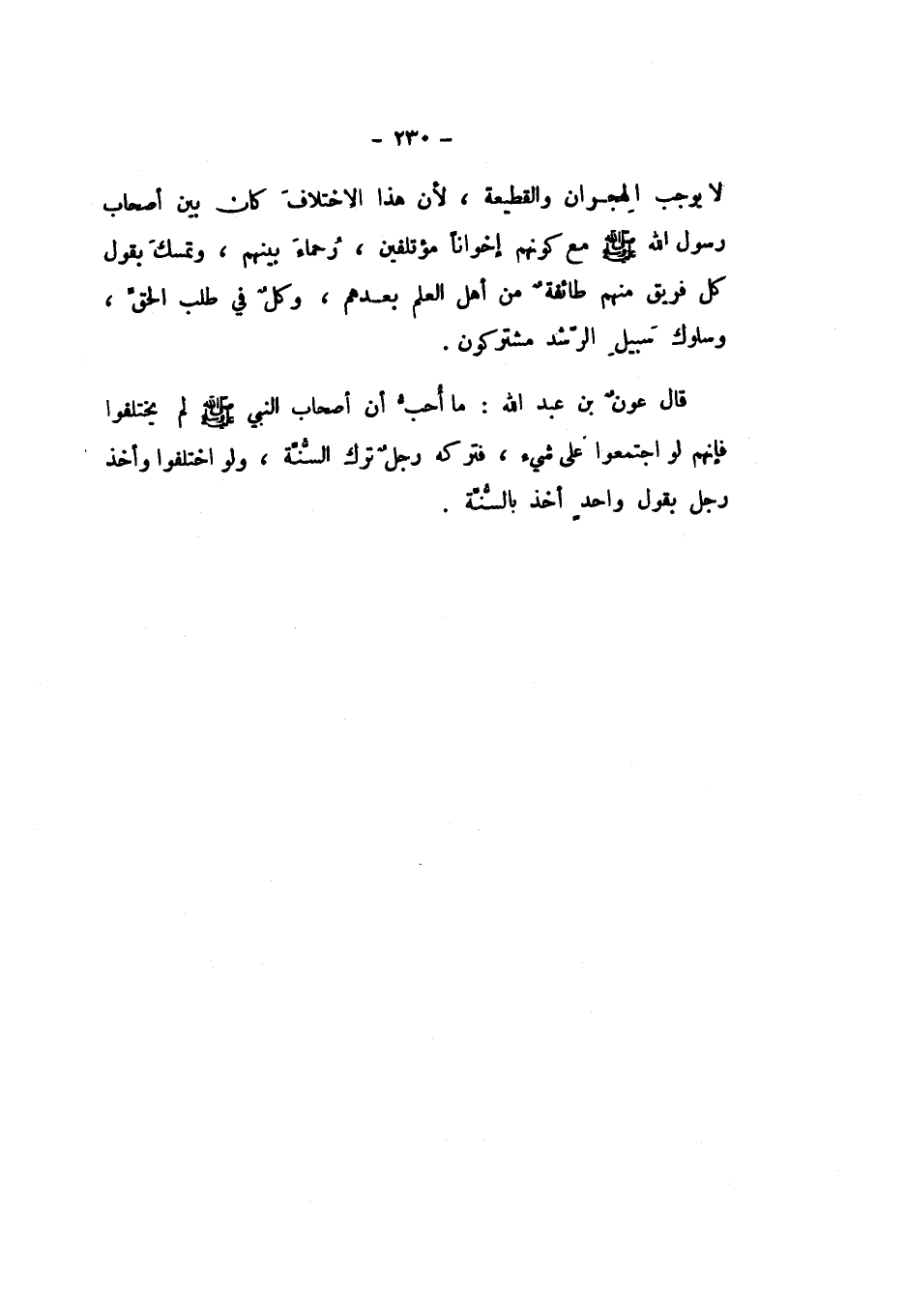 لَا يُوجِبُ الْهِجْرَانَ وَالْقَطِيعَةَ، لأَنَّ هَذَا الاخْتِلافَ كَانَ بَيْنَ أَصْحَابِ رَسُولِ اللَّهِ صَلَّى اللهُ عَلَيْهِ وَسَلَّمَ مَعَ كَوْنِهِمْ إِخْوَانًا مُؤْتَلِفِينَ، رُحَمَاءَ بَيْنَهُمْ، وَتَمَسَّكَ بِقَوْلِ كُلِّ فَرِيقٍ مِنْهُمْ طَائِفَةٌ مِنْ أَهْلِ الْعِلْمِ بَعْدَهُمْ، وَكُلٌّ فِي طَلَبِ الْحَقِّ، وَسُلُوكِ سَبِيلِ الرُّشْدِ مُشْتَرِكُونَ، قَالَ عَوْنُ بْنُ عَبْدِ اللَّهِ: مَا أُحِبُّ أَنَّ أَصْحَابَ النَّبِيِّ صَلَّى اللهُ عَلَيْهِ وَسَلَّمَ لَمْ يَخْتَلِفُوا، فَإِنَّهُمْ لَوِ اجْتَمَعُوا عَلَى شَيْءٍ، فَتَرَكَهُ رَجُلٌ تَرَكَ السُّنَّةَ، وَلَوِ اخْتَلَفُوا وَأَخَذَ رَجُلٌ بِقَوْلِ وَاحِدٍ أَخَذَ بِالسُّنَّةِ.