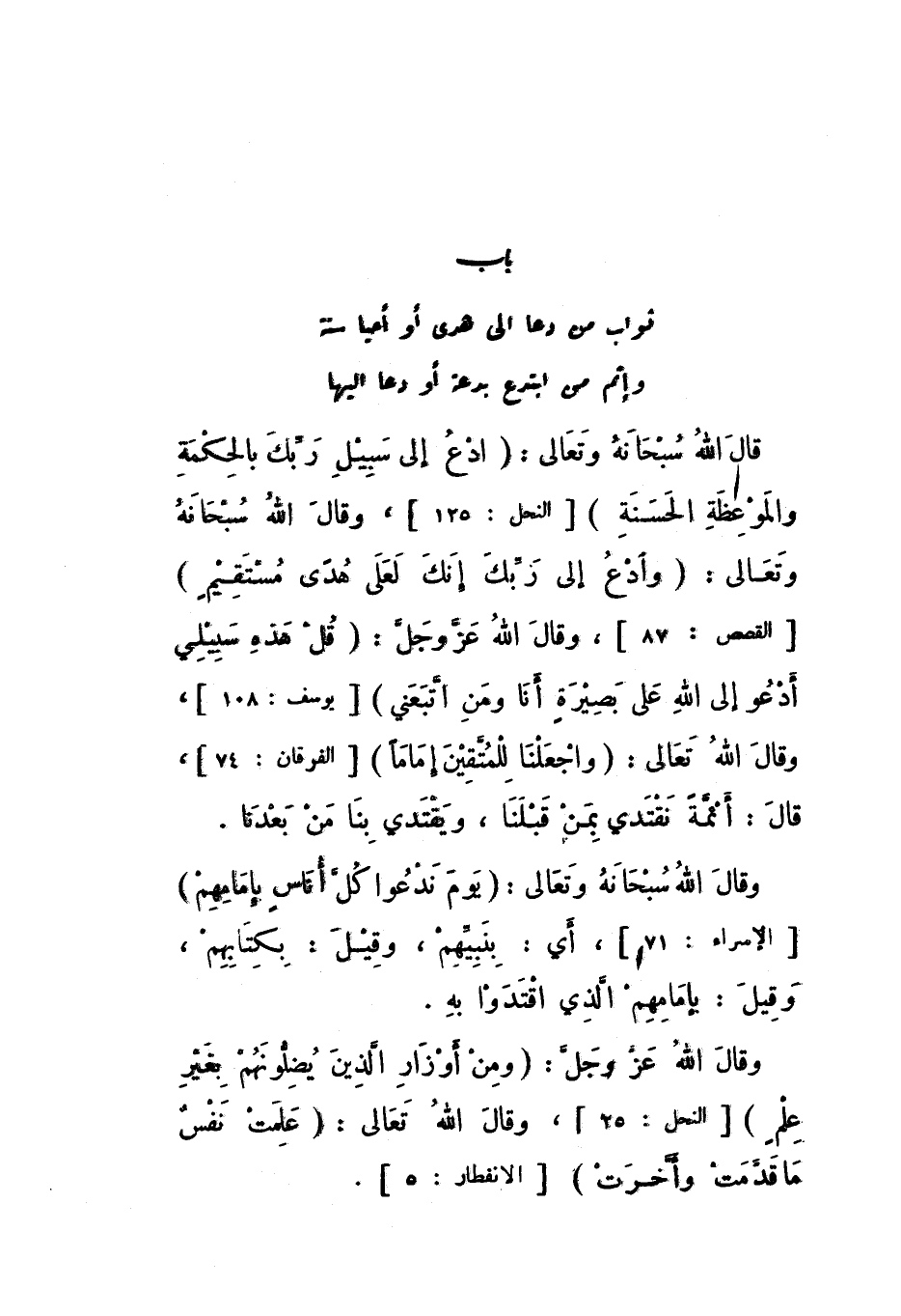 قَالَ اللَّهُ سُبْحَانَهُ وَتَعَالَى: {ادْعُ إِلَى سَبِيلِ رَبِّكَ بِالْحِكْمَةِ وَالْمَوْعِظَةِ الْحَسَنَةِ} [النَّحْل: 125]، وَقَالَ اللَّهُ سُبْحَانَهُ وَتَعَالَى: {وَادْعُ إِلَى رَبِّكَ إِنَّكَ لَعَلَى هُدًى مُسْتَقِيمٍ} [الْحَج: 67]، وَقَالَ اللَّهُ عَزَّ وَجَلَّ: {قُلْ هَذِهِ سَبِيلِي أَدْعُو إِلَى اللَّهِ عَلَى بَصِيرَةٍ أَنَا وَمَنِ اتَّبَعَنِي} [يُوسُف: 108]، وَقَالَ الله تَعَالَى: {وَاجْعَلْنَا لِلْمُتَّقِينَ إِمَامًا} [الْفرْقَان: 74].