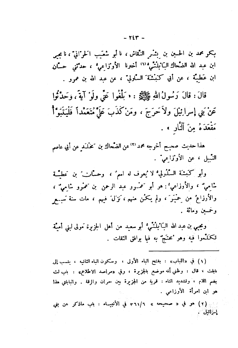 بَكْرٍ مُحَمَّدُ بْنُ الْحُسَيْنِ بْنِ بِشْرٍ النَّقَّاشُ، نَا أَبُو شُعَيْبٍ الْحَرَّانِيُّ، نَا يَحْيَى بْنُ عَبْدِ اللَّهِ الضَّحَّاكُ الْبَابْلُتِّيُّ، أَخْبَرَنَا الأَوْزَاعِيُّ، حَدَّثَنِي حَسَّانُ بْنُ عَطِيَّةَ، عَنْ أَبِي كَبْشَةَ السَّلُولِيِّ، عَنْ عَبْدِ اللَّهِ بْنِ عَمْرٍو، قَالَ رَسُولُ اللَّهِ صَلَّى اللهُ عَلَيْهِ وَسَلَّمَ: «بَلِّغُوا عَنِّي وَلَوْ آيَةً، وَحَدِّثُوا عَنْ بَنِي إِسْرَائِيلَ، وَلا حَرَجَ، وَمَنْ كَذَبَ عَلَيَّ مُتَعَمِّدًا، فَلْيَتَبَوَّأْ مَقْعَدَهُ مِنَ النَّارِ».