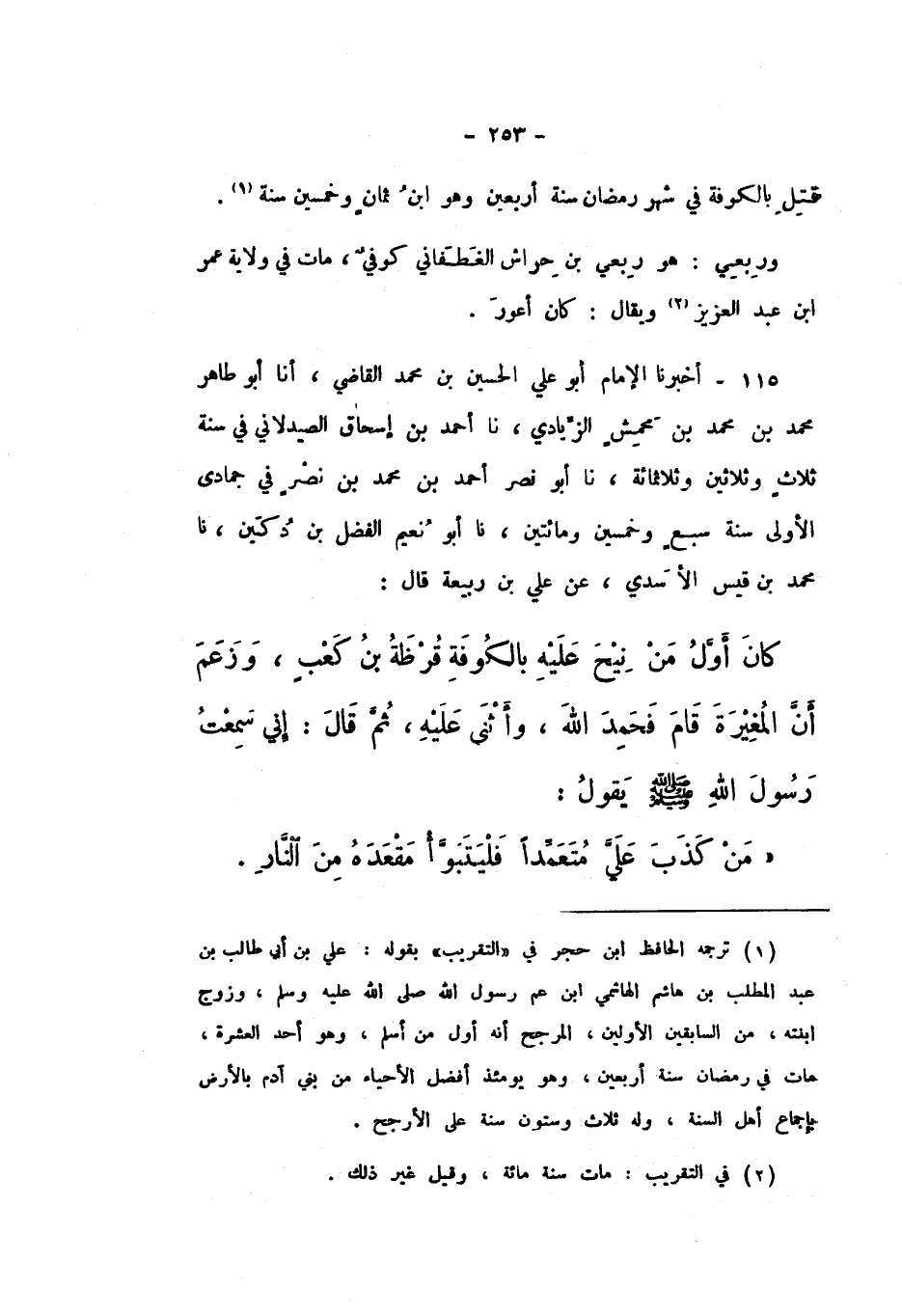 115 - أَخْبَرَنَا الإِمَامُ أَبُو عَلِيٍّ الْحُسَيْنُ بْنُ مُحَمَّدٍ الْقَاضِي، أَنا أَبُو طَاهِرٍ مُحَمَّدُ بْنُ مُحَمَّدِ بْنِ مَحْمشَ الزِّيَادِيُّ، نَا أَحْمَدُ بْنُ إِسْحَاقَ الصَّيْدَلانِيُّ فِي سَنَةِ ثَلاثٍ وَثَلاثِينَ وَثَمَانِ مِائَةٍ، نَا أَبُو نَصْرٍ أَحْمَدُ بْنُ مُحَمَّدِ بْنِ نَصْرٍ فِي جُمَادَى الأُولَى سَنَةَ سَبْعٍ وَخَمْسِينَ وَمِائَتَيْنِ، نَا أَبُو نُعَيْمٍ الْفَضْلُ بْنُ دُكَيْنٍ، نَا مُحَمَّدُ بْنُ قَيْسٍ الأَسَدِيُّ، عَنْ عَلِيِّ بْنِ رَبِيعَةَ، قَالَ: كَانَ أَوَّلَ مَنْ نِيحَ عَلَيْهِ بِالْكُوفَةِ قَرَظَةُ بْنُ كَعْبٍ، وَزَعَمَ أَنَّ الْمُغِيرَةَ قَامَ، فَحَمِدَ اللَّهَ، وَأَثْنَى عَلَيْهِ، ثُمَّ قَالَ: إِنِّي سَمِعْتُ رَسُولَ اللَّهِ صَلَّى اللهُ عَلَيْهِ وَسَلَّمَ، يَقُولُ: " مَنْ كَذَبَ عَلَيَّ مُتَعَمِّدًا، فَلْيَتَبَوَّأْ مَقْعَدَهُ مِنَ النَّارِ.