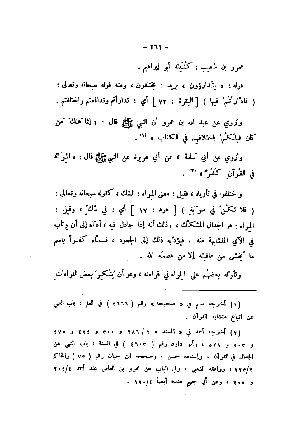 وَاخْتَلَفُوا فِي تَأْوِيلِهِ، فَقِيلَ: مَعْنَى الْمِرَاءِ: الشَّكُّ، كَقَوْلِهِ سُبْحَانَهُ وَتَعَالَى: {فَلا تَكُ فِي مِرْيَةٍ} [هود: 17] أَيْ: فِي شَكٍّ، وَقِيلَ: الْمِرَاءُ: هُوَ الْجِدَالُ الْمُشَكِّكُ، وَذَلِكَ أَنَّهُ إِذَا جَادَلَ فِيهِ، أَدَّاهُ إِلَى أَنْ يَرْتَابَ فِي الآيِ الْمُتَشَابِهَةِ مِنْهُ، فَيُؤَدِّيهِ ذَلِكَ إِلَى الْجُحُودِ، فَسَمَّاهُ كُفْرًا بِاسْمِ مَا يَخْشَى مِنْ عَاقِبَتِهِ إِلا مَنْ عَصَمَهُ اللَّهُ.