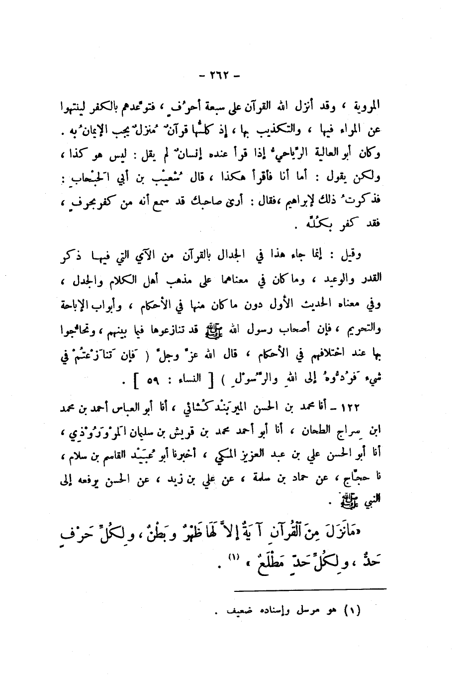 122 - أَنا مُحَمَّدُ بْنُ الْحَسَنِ المربند كشائي، أَنا أَبُو الْعَبَّاسِ أَحْمَدُ بْنُ مُحَمَّدِ بْنِ سِرَاجٍ الطَّحَّانُ، أَنا أَبُو أَحْمَدَ مُحَمَّدُ بْنُ قُرَيْشِ بْنِ سُلَيْمَانَ الْمَرْوَرُّوذِيُّ، أَنا أَبُو الْحَسَنِ عَلِيُّ بْنُ عَبْدِ الْعَزِيزِ الْمَكِّيُّ، أَخْبَرَنَا أَبُو عُبَيْدٍ الْقَاسِمُ بْنُ سَلامٍ، نَا حَجَّاجٌ، عَنْ حَمَّادِ بْنِ سَلَمَةَ، عَنْ عَلِيِّ بْنِ زَيْدٍ، عَنِ الْحَسَنِ، يَرْفَعُهُ إِلَى النَّبِيِّ صَلَّى اللهُ عَلَيْهِ وَسَلَّمَ، قَالَ: «مَا نَزَلَ مِنَ الْقُرْآنِ آيَةٌ إِلا لَهَا ظَهْرٌ وَبَطْنٌ، وَلِكُلِّ حَرْفٍ حَدٌّ، وَلِكُلِّ حَدٍّ مَطْلَعٌ».