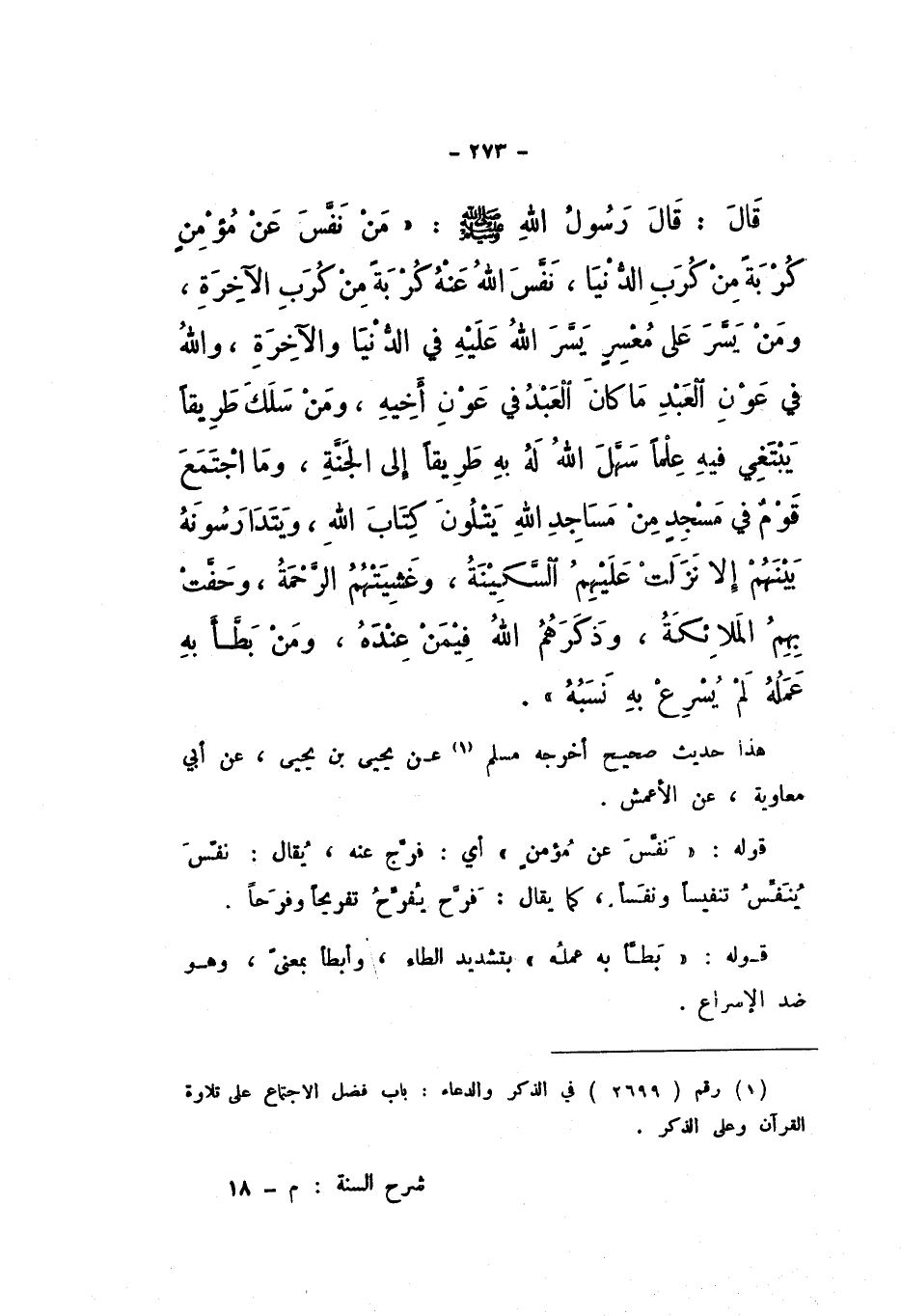 قَالَ: قَالَ رَسُولُ اللَّهِ صَلَّى اللهُ عَلَيْهِ وَسَلَّمَ: «مَنْ نَفَّسَ عَنْ مُؤْمِنٍ كُرْبَةً مِنْ كُرَبِ الدُّنْيَا، نَفَّسَ اللَّهُ عَنْهُ كُرْبَةً مِنْ كُرَبِ الآخِرَةِ، وَمَنْ يَسَّرَ عَلَى مُعْسِرٍ يَسَّرَ اللَّهُ عَلَيْهِ فِي الدُّنْيَا وَالآخِرَةِ، وَاللَّهُ فِي عَوْنِ الْعَبْدِ مَا كَانَ الْعَبْدُ فِي عَوْنِ أَخِيهِ، وَمَنْ سَلَكَ طَرِيقًا يَبْتَغِي فِيهِ عِلْمًا، سَهَّلَ اللَّهُ لَهُ بِهِ طَرِيقًا إِلَى الْجَنَّةِ، وَمَا اجْتَمَعَ قَوْمٌ فِي مَسْجِدٍ مِنْ مَسَاجِدِ اللَّهِ يَتْلُونَ كِتَابَ اللَّهِ، وَيَتَدَارَسُونَهُ بَيْنَهُمْ إِلا نَزَلَتْ عَلَيْهِمُ السَّكِينَةُ، وَغَشِيَتْهُمُ الرَّحْمَةُ، وَحَفَّتْ بِهِمُ الْمَلائِكَةُ، وَذَكَرَهُمُ اللَّهُ فِيمَنْ عِنْدَهُ، وَمَنْ بَطَّأَ بِهِ عَمَلُهُ لَمْ يُسْرِعْ بِهِ نَسَبُهُ».