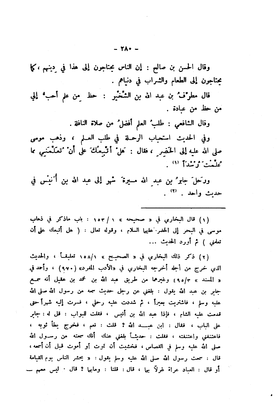 وَرَحَلَ جَابِرُ بْنُ عَبْدِ اللَّهِ مَسِيرَةَ شَهْرٍ إِلَى عَبْدِ اللَّهِ بْنِ أُنَيْسٍ فِي حَدِيثٍ وَاحِدٍ.