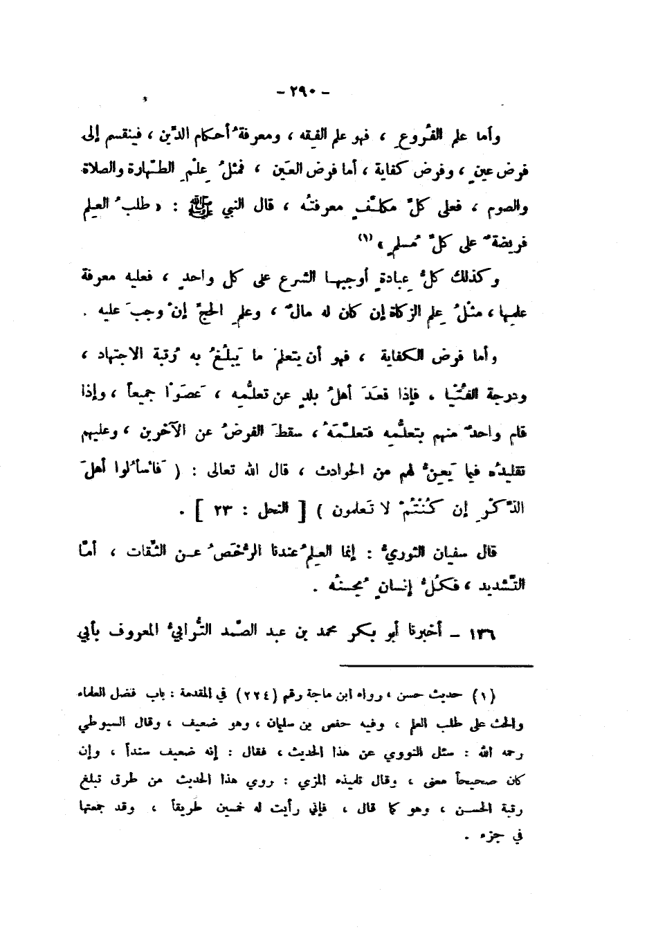 وَأَمَّا عِلْمُ الْفُرُوعِ: فَهُوَ عِلْمُ الْفِقْهِ، وَمَعْرِفَةُ أَحْكَامِ الدِّينِ، فَيَنْقَسِمُ إِلَى فَرْضِ عَيْنٍ، وَفَرْضِ كِفَايَةٍ، أَمَّا فَرْضُ الْعَيْنِ، فَمِثْلُ عِلْمِ الطَّهَارَةِ وَالصَّلاةِ وَالصَّوْمِ، فَعَلَى كُلِّ مُكَلَّفٍ مَعْرِفَتُهُ، قَالَ النَّبِيُّ صَلَّى اللهُ عَلَيْهِ وَسَلَّمَ: «طَلَبُ الْعِلْمِ فَرِيضَةٌ عَلَى كُلِّ مُسْلِمٍ».
