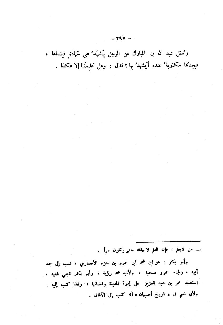 وَسُئِلَ عَبْدُ اللَّهِ بْنُ الْمُبَارَكِ عَنِ الرَّجُلِ يُشْهَدُ عَلَى شَهَادَةٍ فَيَنْسَاهَا، فَيَجِدُهَا مَكْتُوبَةً عِنْدَهُ، أَيَشْهَدُ بِهَا؟ فَقَالَ: وَهَلْ عَلِمْنَا إِلا هَكَذَا.