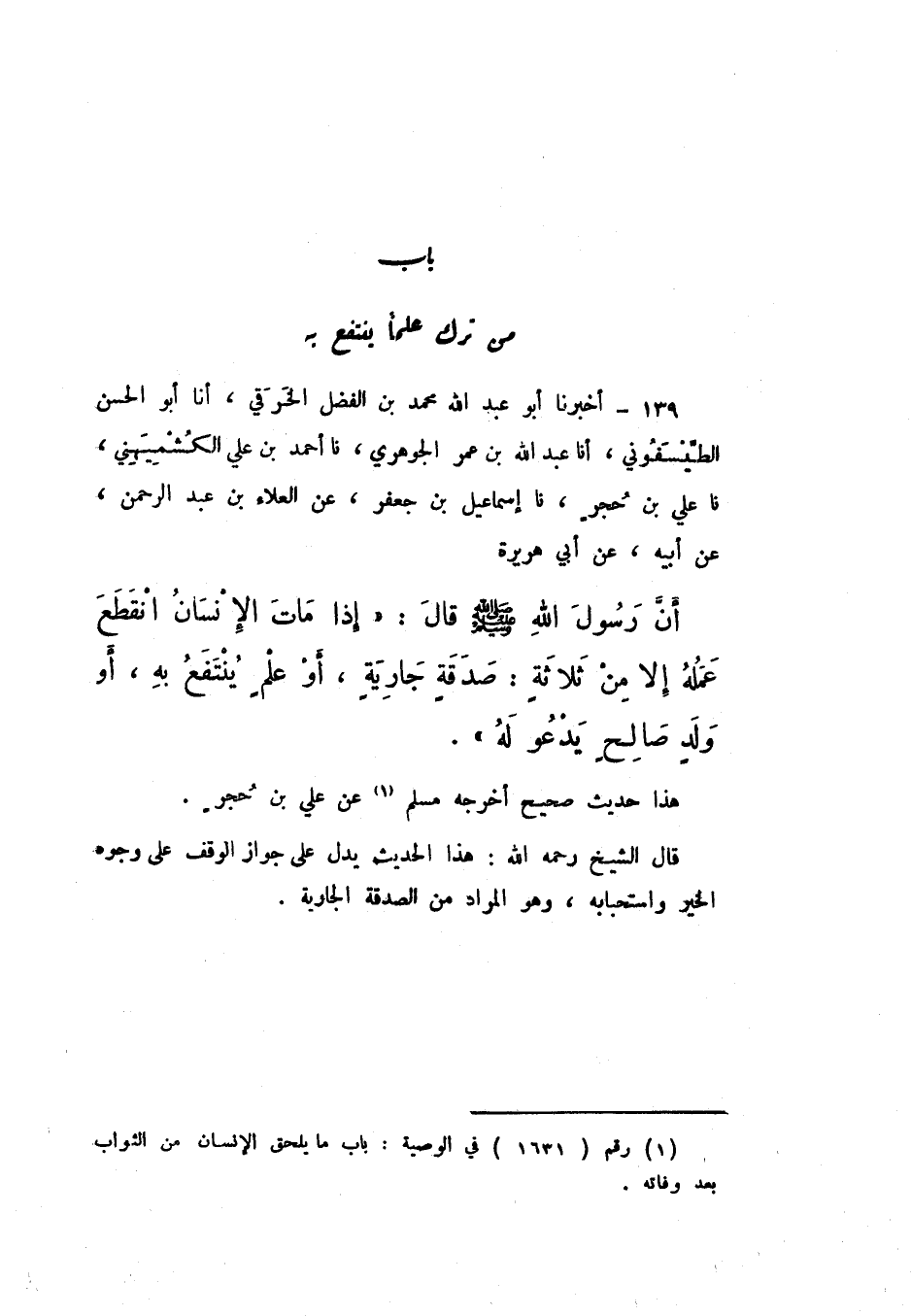 139 - أَخْبَرَنَا أَبُو عَبْدِ اللَّهِ مُحَمَّدُ بْنُ الْفَضْلِ الْخِرَقِيُّ، أَنا أَبُو الْحَسَنِ الطَّيْسَفُونِيُّ، أَنا عَبْدُ اللَّهِ بْنُ عُمَرَ الْجَوْهَرِيُّ، نَا أَحْمَدُ بْنُ عَلِيٍّ الْكُشْمِيهَنِيُّ، نَا عَلِيُّ بْنُ حُجْرٍ، نَا إِسْمَاعِيلُ بْنُ جَعْفَرٍ، عَنِ الْعَلاءِ بْنِ عَبْدِ الرَّحْمَنِ، عَنْ أَبِيهِ، عَنْ أَبِي هُرَيْرَةَ، أَنَّ رَسُولَ اللَّهِ صَلَّى اللهُ عَلَيْهِ وَسَلَّمَ، قَالَ: " إِذَا مَاتَ الإِنْسَانُ انْقَطَعَ عَمَلُهُ إِلا مِنْ ثَلاثَةٍ: صَدَقَةٍ جَارِيَةٍ، أَوْ عِلْمٍ يُنْتَفَعُ بِهِ، أَوْ وَلَدٍ صَالِحٍ يَدْعُو لَهُ ".