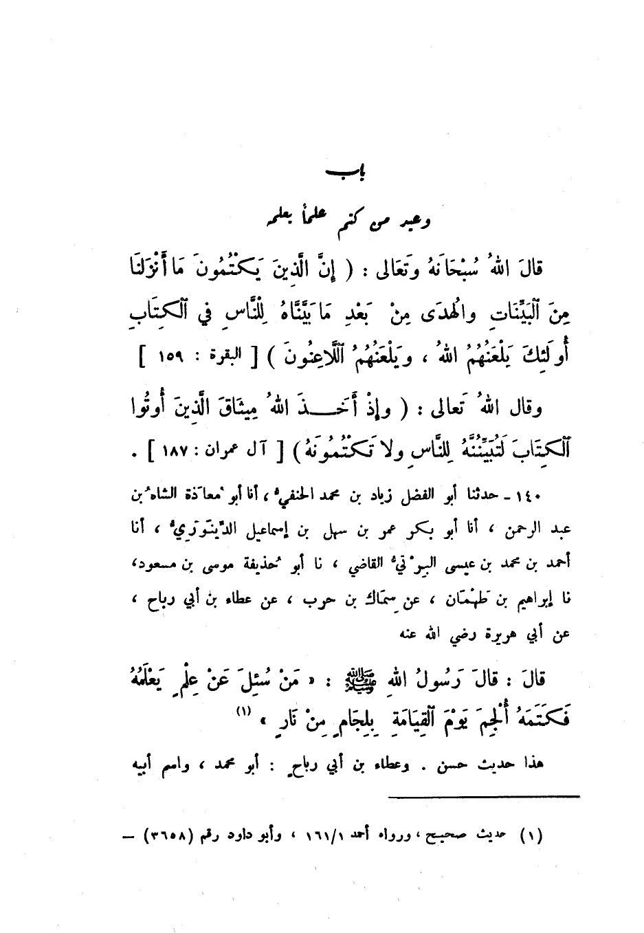 بَابُ وَعِيدِ مَنْ كَتَمَ عِلْمًا يَعْلَمُهُ
