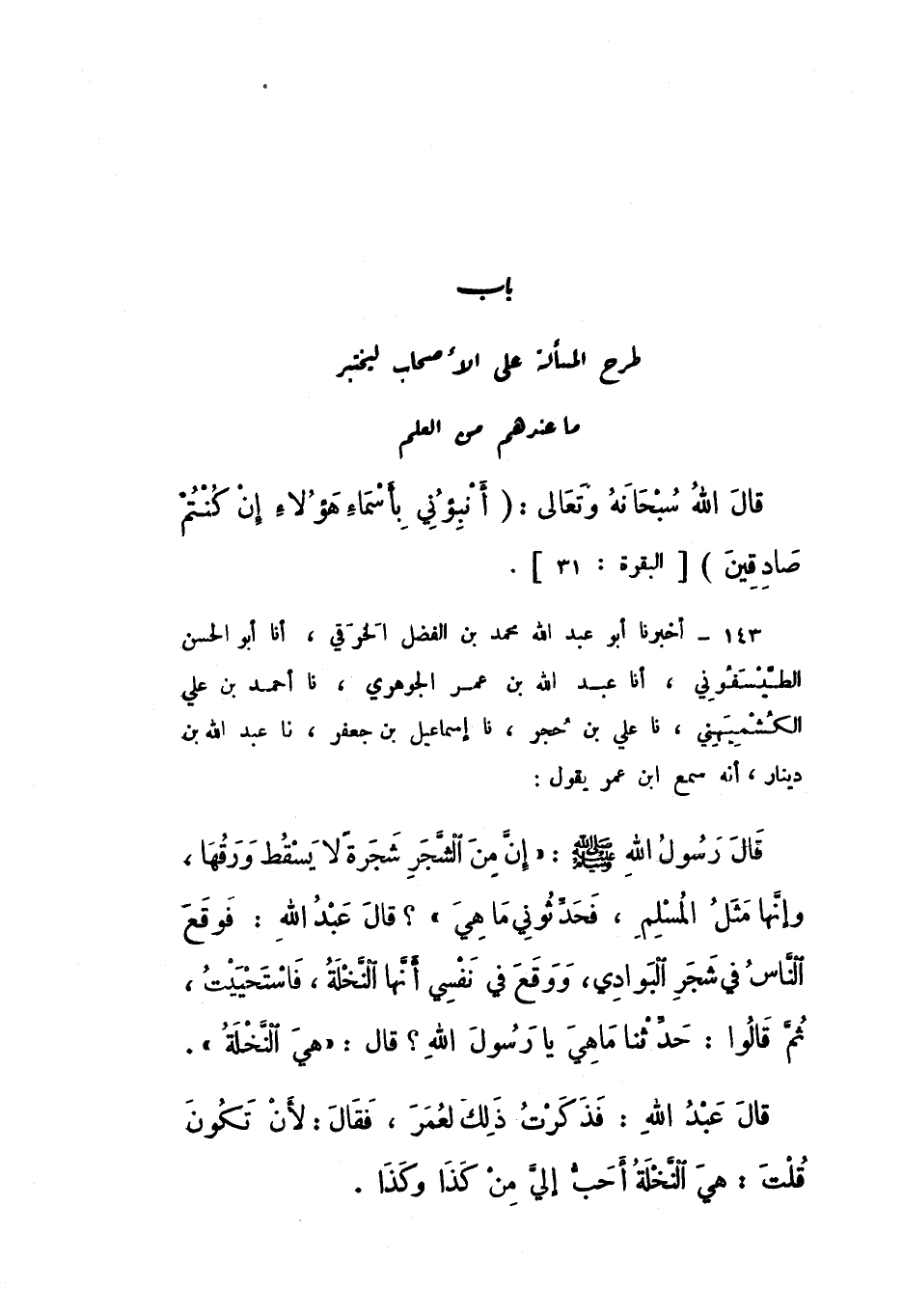 143 - أَخْبَرَنَا أَبُو عَبْدِ اللَّهِ مُحَمَّدُ بْنُ الْفَضْلِ الْخِرَقِيُّ، أَنا أَبُو الْحَسَنِ الطَّيْسَفُونِيُّ، أَنا عَبْدُ اللَّهِ بْنُ عُمَرَ الْجَوْهَرِيُّ، نَا أَحْمَدُ بْنُ عَلِيٍّ الْكُشْمِيهَنِيُّ، نَا عَلِيُّ بْنُ حُجْرٍ، نَا إِسْمَاعِيلُ بْنُ جَعْفَرٍ، نَا عَبْدُ اللَّهِ بْنُ دِينَارٍ، أَنَّهُ سَمِعَ ابْنَ عُمَرَ، يَقُولُ: قَالَ رَسُولُ اللَّهِ صَلَّى اللهُ عَلَيْهِ وَسَلَّمَ: " إِنَّ مِنَ الشَّجَرِ شَجَرَةً لَا يَسْقُطُ وَرَقُهَا، وَإِنَّهَا مَثَلُ الْمُسْلِمِ، فَحَدِّثُونِي مَا هِيَ؟ قَالَ عَبْدُ اللَّهِ: فَوَقَعَ النَّاسُ فِي شَجَرِ الْبَوَادِي، وَوَقَعَ فِي نَفْسِي أَنَّهَا النَّخْلَةُ، فَاسْتَحْيَيْتُ، ثُمَّ قَالُوا: حَدِّثْنَا مَا هِيَ، يَا رَسُولَ اللَّهِ؟ قَالَ: هِيَ النَّخْلَةُ ".