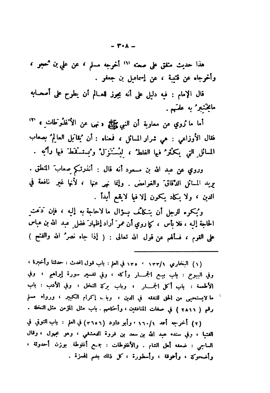 أَمَّا مَا رُوِيَ عَنْ مُعَاوِيَةَ، أَنَّ النَّبِيَّ صَلَّى اللهُ عَلَيْهِ وَسَلَّمَ «نَهَى عَنِ الأُغْلُوطَاتِ».