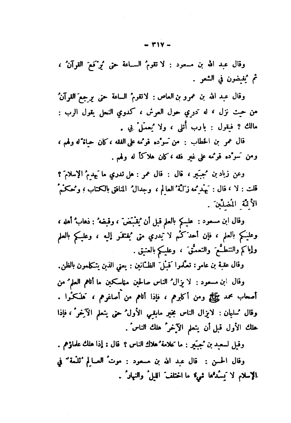 وَقَالَ ابْنُ مَسْعُودٍ: " عَلَيْكُمْ بِالْعِلْمِ قَبْلَ أَنْ يُقْبَضَ، وَقَبْضُهُ ذَهَابُ أَهْلِهِ، وَعَلَيْكُمْ بِالْعِلْمِ، فَإِنَّ أَحَدَكُمْ لَا يَدْرِي مَتَى يُفْتَقَرُ إِلَيْهِ، وَعَلَيْكُمْ بِالْعِلْمِ، وَإِيَّاكُمْ وَالتَّنَطُّعَ وَالتَّعَمُّقَ، وَعَلَيْكُمْ بِالْعَتِيقِ.