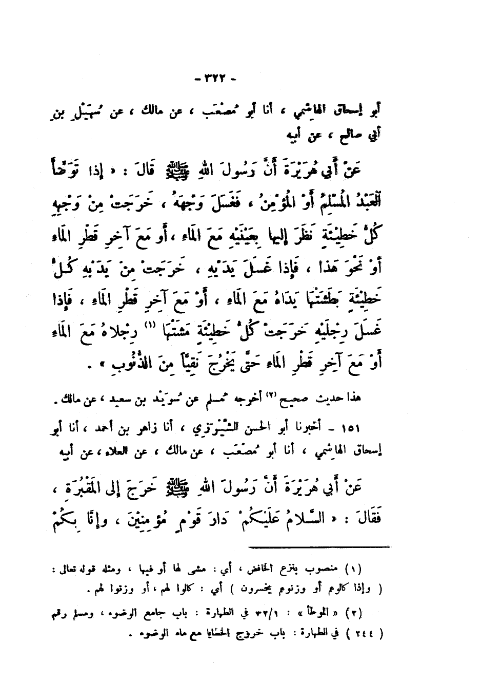أَبُو إِسْحَاقَ الْهَاشِمِيُّ، أَنا أَبُو مُصْعَبٍ، عَنْ مَالِكٍ، عَنْ سُهَيْلِ بْنِ أَبِي صَالِحٍ، عَنْ أَبِيهِ، عَنْ أَبِي هُرَيْرَةَ، أَنَّ رَسُولَ اللَّهِ صَلَّى اللهُ عَلَيْهِ وَسَلَّمَ، قَالَ: «إِذَا تَوَضَّأَ الْعَبْدُ الْمُسْلِمُ أَوِ الْمُؤْمِنُ، فَغَسَلَ وَجْهَهُ، خَرَجَتْ مِنْ وَجْهِهِ كُلُّ خَطِيئَةٍ نَظَرَ إِلَيْهَا بِعَيْنَيْهِ مَعَ الْمَاءِ، أَوْ مَعَ آخِرِ قَطْرِ الْمَاءِ أَوْ نَحْوَ هَذَا، فَإِذَا غَسَلَ يَدَيْهِ، خَرَجَتْ مِنْ يَدَيْهِ كُلُّ خَطِيئَةٍ بَطَشَتْهَا يَدَاهُ مَعَ الْمَاءِ، أَوْ مَعَ آخِرِ قَطْرِ الْمَاءِ، فَإِذَا غَسَلَ رِجْلَيْهِ، خَرَجَتْ كُلُّ خَطِيئَةٍ مَشَتْهَا رِجْلاهُ مَعَ الْمَاءِ، أَوْ مَعَ آخِرِ قَطْرِ الْمَاءِ، حَتَّى يَخْرُجَ نَقِيًّا مِنَ الذُّنُوبِ».