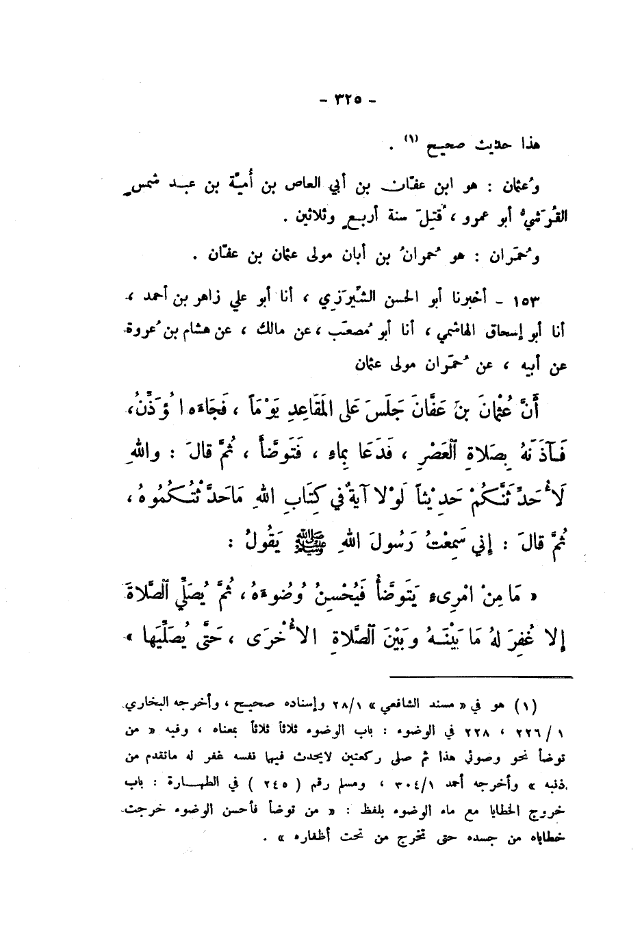 153 - أَخْبَرَنَا أَبُو الْحَسَنِ الشِّيرَزِيُّ، أَنا أَبُو عَلِيٍّ زَاهِرُ بْنُ أَحْمَدَ، أَنا أَبُو إِسْحَاقَ الْهَاشِمِيُّ، أَنا أَبُو مُصْعَبٍ، عَنْ مَالِكٍ، عَنْ هِشَامِ بْنِ عُرْوَةَ، عَنْ أَبِيهِ، عَنْ حُمْرَانَ، مَوْلَى عُثْمَانَ، أَنَّ عُثْمَانَ بْنَ عَفَّانَ جَلَسَ عَلَى الْمَقَاعِدِ يَوْمًا، فَجَاءَهُ الْمُؤَذِّنُ، فَآذَنَهُ بِصَلاةِ الْعَصْرِ، فَدَعَا بِمَاءٍ، فَتَوَضَّأَ، ثُمَّ قَالَ: وَاللَّهِ لأُحَدِّثَنَّكُمْ حَدِيثًا لَوْلا آيَةٌ فِي كِتَابِ اللَّهِ مَا حَدَّثْتُكُمُوهُ، ثُمَّ قَالَ: إِنِّي سَمِعْتُ رَسُولَ اللَّهِ صَلَّى اللهُ عَلَيْهِ وَسَلَّمَ، يَقُولُ: «مَا مِنَ امْرِئٍ يَتَوَضَّأُ، فَيُحْسِنُ وُضُوءَهُ، ثُمَّ يُصَلِّي الصَّلاةَ إِلا غُفِرَ لَهُ مَا بَيْنَهُ وَبَيْنَ الصَّلاةِ الأُخْرَى، حَتَّى يُصَلِّيَهَا».