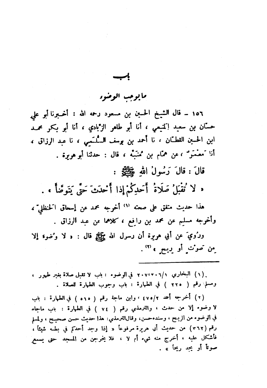 156 - قَالَ الشَّيْخُ الْحُسَيْنُ بْنُ مَسْعُودٍ، رَحِمَهُ اللَّهُ: أَخْبَرَنَا أَبُو عَلِيٍّ حَسَّانُ بْنُ سَعِيدٍ الْمَنِيعِيُّ، أَنا أَبُو طَاهِرٍ الزِّيَادِيُّ، أَنا أَبُو بَكْرٍ مُحَمَّدُ بْنُ الْحُسَيْنِ الْقَطَّانُ، نَا أَحْمَدُ بْنُ يُوسُفَ السُّلَمِيُّ، نَا عَبْدُ الرَّزَّاقِ، أَنا مَعْمَرٌ، عَنْ هَمَّامِ بْنِ مُنَبِّهٍ، قَالَ: حَدَّثَنَا أَبُو هُرَيْرَةَ، قَالَ: قَالَ رَسُولُ اللَّهِ صَلَّى اللهُ عَلَيْهِ وَسَلَّمَ: «لَا تُقْبَلُ صَلاةُ أَحَدِكُمْ إِذَا أَحْدَثَ حَتَّى يَتَوَضَّأَ».