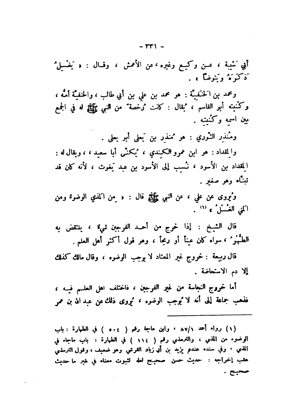 وَيُرْوَى عَنْ عَلِيٍّ، عَنِ النَّبِيِّ صَلَّى اللهُ عَلَيْهِ وَسَلَّمَ، قَالَ: «مِنَ الْمَذْيِ الْوُضُوءُ، وَمِنَ الْمَنِيِّ الْغُسْلُ».