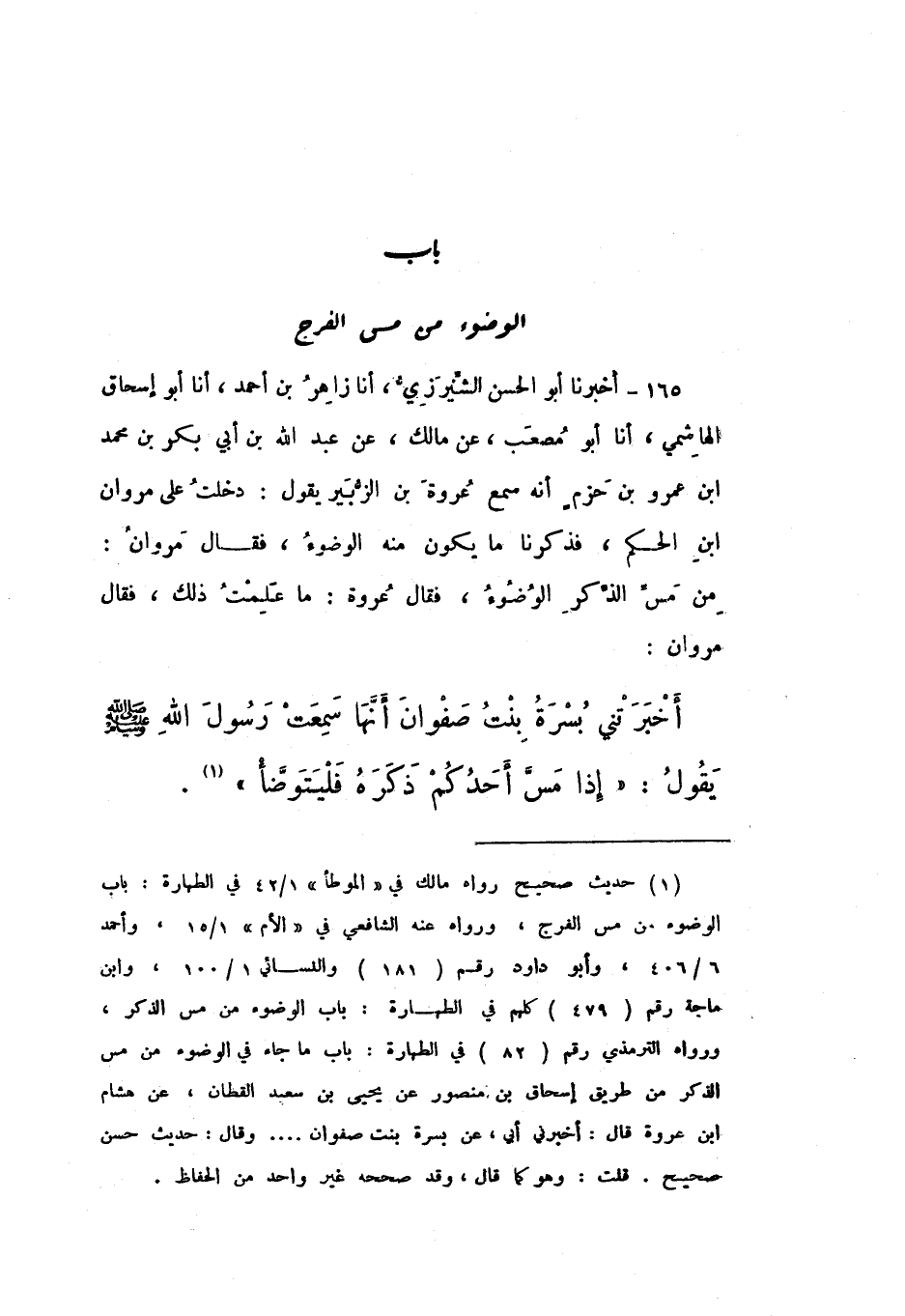 165 - أَخْبَرَنَا أَبُو الْحَسَنِ الشِّيرَزِيُّ، أَنا زَاهِرُ بْنُ أَحْمَدَ، أَنا أَبُو إِسْحَاقَ الْهَاشِمِيُّ، أَنا أَبُو مُصْعَبٍ، عَنْ مَالِكٍ، عَنْ عَبْدِ اللَّهِ بْنِ أَبِي بَكْرِ بْنِ مُحَمَّدِ بْنِ عَمْرِو بْنِ حَزْمٍ، أَنَّهُ سَمِعَ عُرْوَةَ بْنَ الزُّبَيْرِ، يَقُولُ: دَخَلْتُ عَلَى مَرْوَانَ بْنِ الْحَكَمِ، فَذَكَرْنَا مَا يَكُونُ مِنْهُ الْوُضُوءُ، فَقَالَ مَرْوَانُ: مِنْ مَسِّ الذَّكَرِ الْوُضُوءُ، فَقَالَ عُرْوَةُ: مَا عَلِمْتُ ذَلِكَ، فَقَالَ مَرْوَانُ: أَخْبَرَتْنِي بُسْرَةُ بِنْتُ صَفْوَانَ، أَنَّهَا سَمِعَتْ رَسُولَ اللَّهِ صَلَّى اللهُ عَلَيْهِ وَسَلَّمَ، يَقُولُ: «إِذَا مَسَّ أَحَدُكُمْ ذَكَرَهُ فَلْيَتَوَضَّأْ».