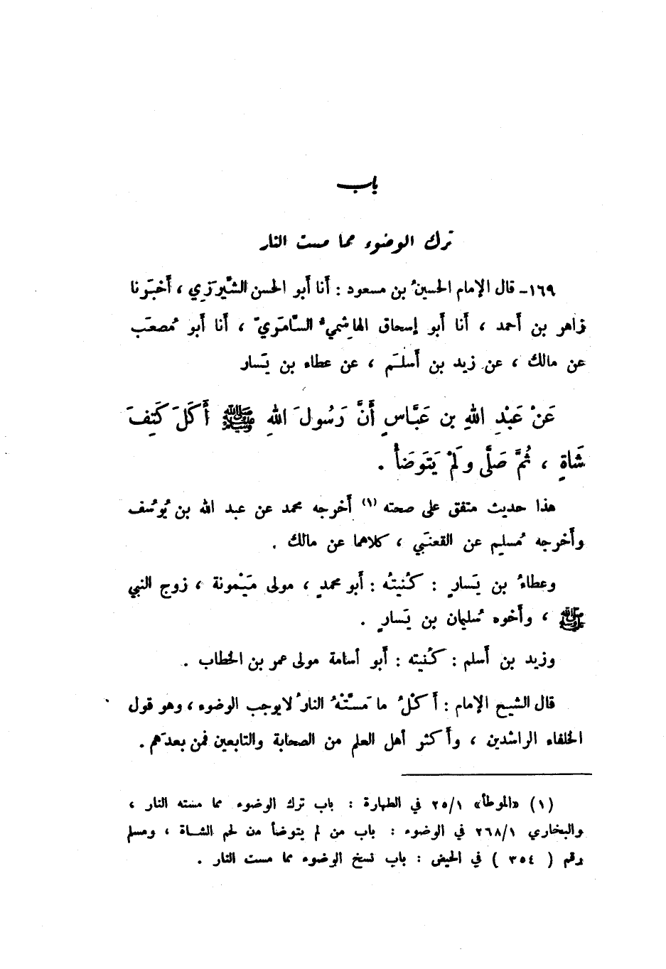 169 - قَالَ الإِمَامُ الْحُسَيْنُ بْنُ مَسْعُودٍ: أَنا أَبُو الْحَسَنِ الشِّيرَزِيُّ، أَخْبَرَنَا زَاهِرُ بْنُ أَحْمَدَ، أَنا أَبُو إِسْحَاقَ الْهَاشِمِيُّ السَّامَرِّيُّ، أَنا أَبُو مُصْعَبٍ، عَنْ مَالِكٍ، عَنْ زَيْدِ بْنِ أَسْلَمَ، عَنْ عَطَاءِ بْنِ يَسَارٍ، عَنْ عَبْدِ اللَّهِ بْنِ عَبَّاسٍ، «أَنَّ رَسُولَ اللَّهِ صَلَّى اللهُ عَلَيْهِ وَسَلَّمَ أَكَلَ كَتِفَ شَاةٍ، ثُمَّ صَلَّى وَلَمْ يَتَوَضَّأْ».