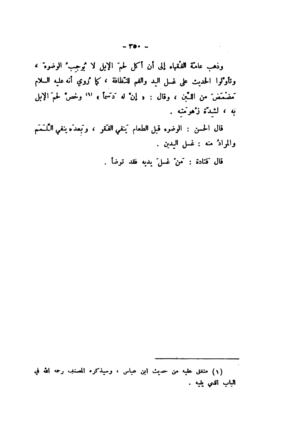 وَذَهَبَ عَامَّةُ الْفُقَهَاءِ إِلَى أَنَّ أَكْلَ لَحْمِ الإِبِلِ لَا يُوجِبُ الْوُضُوءَ، وَتَأَوَّلُوا الْحَدِيثَ عَلَى غَسْلِ الْيَدِ وَالْفَمِ لِلنَّظَافَةِ، كَمَا رُوِيَ: أَنَّهُ عَلَيْهِ السَّلامُ مَضْمَضَ مِنَ اللَّبَنِ، وَقَالَ: «إِنَّ لَهُ دَسَمًا» وَخَصَّ لَحْمَ الإِبِلِ بِهِ، لِشِدَّةِ زُهُومَتِهِ.