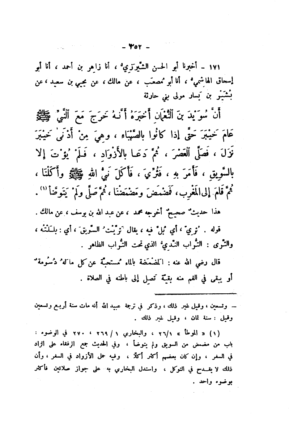 71 - أَخْبَرَنَا أَبُو الْحَسَنِ الشِّيرَزِيُّ، أَنا زَاهِرُ بْنُ أَحْمَدَ، أَنا أَبُو إِسْحَاقَ الْهَاشِمِيُّ، أَنا أَبُو مُصْعَبٍ، عَنْ مَالِكٍ، عَنْ يَحْيَى بْنِ سَعِيدٍ، عَنْ بُشَيْرِ بْنِ يَسَارٍ، مَوْلَى بَنِي حَارِثَةَ، أَنَّ سُوَيْدَ بْنَ النُّعْمَانِ أَخْبَرَهُ «أَنَّهُ خَرَجَ مَعَ النَّبِيِّ صَلَّى اللهُ عَلَيْهِ وَسَلَّمَ عَامَ خَيْبَرَ حَتَّى إِذَا كَانُوا بِالصَّهْبَاءِ، وَهِيَ مِنْ أَدْنَى خَيْبَرَ، نَزَلَ فَصَلَّى الْعَصْرَ، ثُمَّ دَعَا بِالأَزْوَادِ، فَلَمْ يُؤْتَ إِلا بِالسَّوِيقِ، فَأَمَرَ بِهِ، فَثُرِّيَ، فَأَكَلَ نَبِيُّ اللَّهِ صَلَّى اللهُ عَلَيْهِ وَسَلَّمَ، وَأَكَلْنَا، ثُمَّ قَامَ إِلَى الْمَغْرِبِ، فَمَضْمَضَ وَمَضْمَضْنَا، ثُمَّ صَلَّى وَلَمْ يَتَوَضَّأْ».