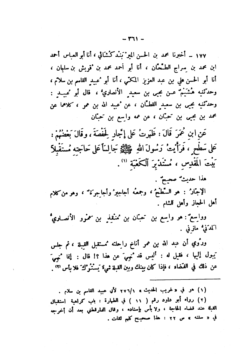 177 - أَخْبَرَنَا مُحَمَّدُ بْنُ الْحَسَنِ الْمِيرَبَنْدَكُشَائِيُّ، أَنا أَبُو الْعَبَّاسِ أَحْمَدُ بْنُ مُحَمَّدِ بْنِ سِرَاجٍ الطَّحَّانُ، أَنا أَبُو أَحْمَدَ مُحَمَّدُ بْنُ قُرَيْشِ بْنِ سُلَيْمَانَ، أَنا أَبُو الْحَسَنِ عَلِيُّ بْنُ عَبْدِ الْعَزِيزِ الْمَكِّيُّ، أَنا أَبُو عُبَيْدٍ الْقَاسِمُ بْنُ سَلامٍ، حَدَّثَنِيهِ هُشَيْمٌ، عَنْ يَحْيَى بْنِ سَعِيدٍ الأَنْصَارِيِّ، قَالَ أَبُو عُبَيْدٍ: وَحَدَّثَنِيهِ يَحْيَى بْنُ سَعِيدٍ الْقَطَّانُ، عَنْ عُبَيْدِ اللَّهِ بْنِ عُمَرَ، كِلاهُمَا، عَنْ مُحَمَّدِ بْنِ يَحْيَى بْنِ حَبَّانَ، عَنْ عَمِّهِ وَاسِعِ بْنِ حَبَّانَ، عَنِ ابْنِ عُمَرَ، قَالَ: " ظَهَرْتُ عَلَى إِجَّارٍ لِحَفْصَةَ، وَقَالَ بَعْضُهُمْ: عَلَى سَطْحٍ، فَرَأَيْتُ رَسُولَ اللَّهِ صَلَّى اللهُ عَلَيْهِ وَسَلَّمَ جَالِسًا عَلَى حَاجَتِهِ مُسْتَقْبِلا بَيْتَ الْمَقْدِسِ، مُسْتَدْبِرَ الْكَعْبَةِ ".