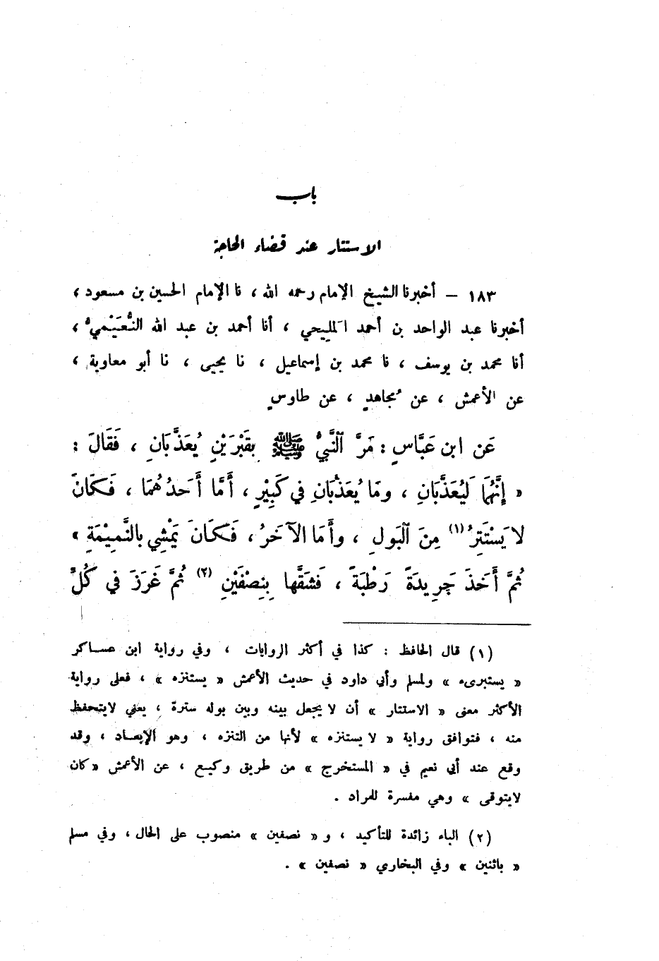 183 - أخبرنَا الشَّيْخُ الإِمَامُ، رَحِمَهُ اللَّهُ، نَا الإِمَامُ الْحُسَيْنُ بْنُ مَسْعُودٍ أَخْبَرَنَا عَبْدُ الْوَاحِدِ بْنُ أَحْمَدَ الْمَلِيحِيُّ، أَنا أَحْمَدُ بْنُ عَبْدِ اللَّهِ النُّعَيْمِيُّ، أَنا مُحَمَّدُ بْنُ يُوسُفَ، نَا مُحَمَّدُ بْنُ إِسْمَاعِيلَ، نَا يَحْيَى، نَا أَبُو مُعَاوِيَةَ، عَنِ الأَعْمَشِ، عَنْ مُجَاهِدٍ، عَنْ طَاوُسٍ، عَنِ ابْنِ عَبَّاسٍ " مَرَّ النَّبِيُّ صَلَّى اللهُ عَلَيْهِ وَسَلَّمَ بِقَبْرَيْنِ يُعَذَّبَانِ، فَقَالَ: إِنَّهُمَا لَيُعَذَّبَانِ، وَمَا يُعَذَّبَانِ فِي كَبِيرٍ، أَمَّا أَحَدُهُمَا، فَكَانَ لَا يَسْتَتِرُ مِنَ الْبَوْلِ، وَأَمَّا الآخَرُ، فَكَانَ يَمْشِي بِالنَّمِيمَةِ، ثُمَّ أَخَذَ جَرِيدَةً رَطْبَةً، فَشَقَّهَا بِنِصْفَيْنِ، ثُمَّ غَرَزَ فِي كُلِّ