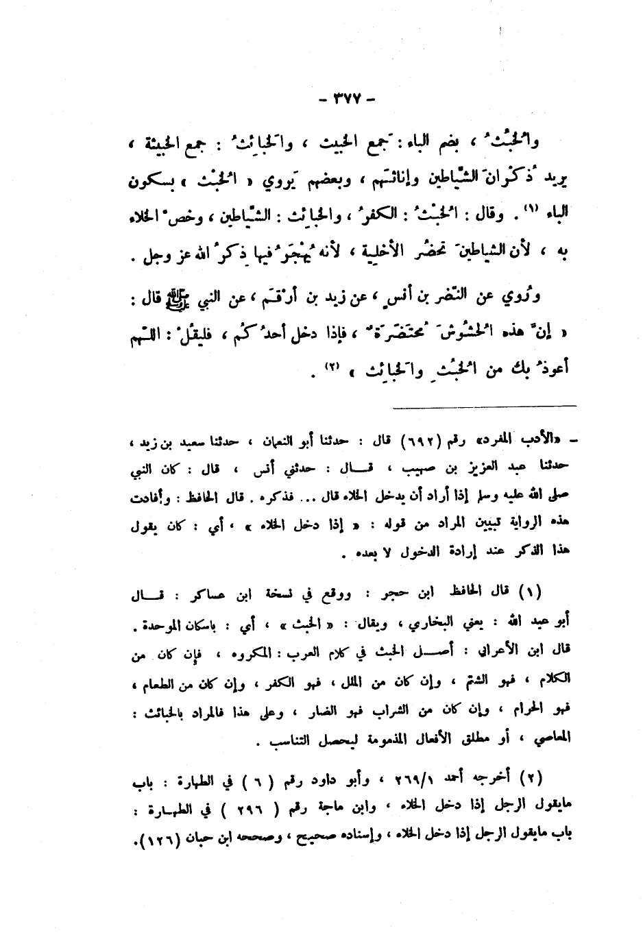 وَالْخُبُثُ، بِضَمِّ الْبَاءِ: جَمْعُ الْخَبِيثِ، وَالْخَبَائِثُ: جَمْعُ الْخَبِيثَةِ، يُرِيدُ: ذُكْرَانَ الشَّيَاطِينِ وَإِنَاثِهِمْ، وَبَعْضُهُمْ يَرْوِي «الْخُبْثَ» بِسُكُونِ الْبَاءِ، وَقَالَ: الْخُبْثُ: الْكُفْرُ، وَالْخَبَائِثُ: الشَّيَاطِينُ، وَخَصَّ الْخَلاءَ بِهِ، لأَنَّ الشَّيَاطِينَ تَحْضُرُ الأَخْلِيَةَ، لأَنَّهُ يُهْجَرُ فِيهَا ذِكْرُ اللَّهِ عَزَّ وَجَلَّ، وَرُوِيَ عَنِ النَّضْرِ بْنِ أَنَسٍ، عَنْ زَيْدِ بْنِ أَرْقَمَ، عَنِ النَّبِيِّ صَلَّى اللهُ عَلَيْهِ وَسَلَّمَ، قَالَ: " إِنَّ هَذِهِ الْحُشُوشَ مُحْتَضَرَةٌ، فَإِذَا دَخَلَ أَحَدُكُمْ، فَلْيَقُلِ: اللَّهُمَّ إِنِّي أَعُوذُ بِكَ مِنَ الْخُبْثِ وَالْخَبَائِثِ ".