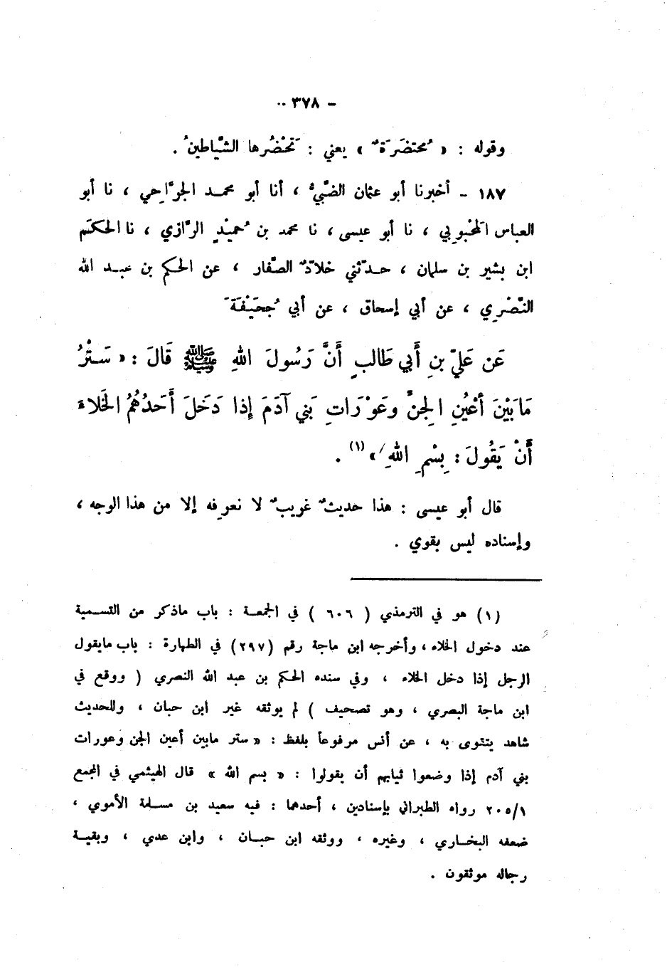 187 - أَخْبَرَنَا أَبُو عُثْمَانَ الضَّبِّيُّ، أَنا أَبُو مُحَمَّدٍ الْجَرَّاحِيُّ، نَا أَبُو الْعَبَّاسِ الْمَحْبُوبِيُّ، نَا أَبُو عِيسَى، نَا مُحَمَّدُ بْنُ حُمَيْدٍ الرَّازِيُّ، نَا الْحَكَمُ بْنُ بَشِيرِ بْنِ سَلْمَانَ، حَدَّثَنِي خَلادٌ الصَّفَّارُ، عَنِ الْحَكَمِ بْنِ عَبْدِ اللَّهِ النَّضْرِيِّ، عَنْ أَبِي إِسْحَاقَ، عَنْ أَبِي جُحَيْفَةَ، عَنْ عَلِيِّ بْنِ أَبِي طَالِبٍ، أَنَّ رَسُولَ اللَّهِ صَلَّى اللهُ عَلَيْهِ وَسَلَّمَ، قَالَ: " سَتْرُ مَا بَيْنَ أَعْيُنِ الْجِنِّ، وَعَوْرَاتِ بَنِي آدَمَ إِذَا دَخَلَ أَحَدُهُمُ الْخَلاءَ أَنْ يَقُولَ: بِسْمِ اللَّهِ ".