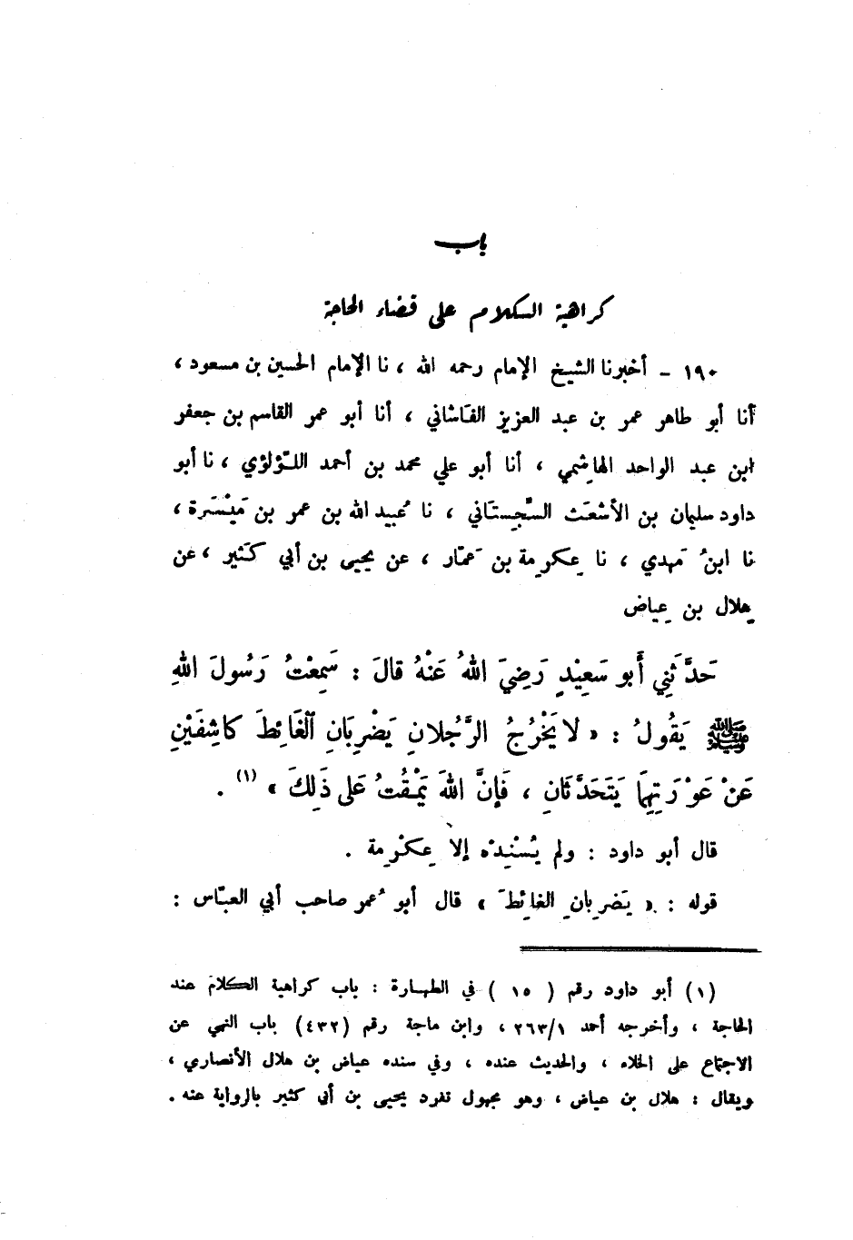 190 - أَخْبَرَنَا الشَّيْخُ الإِمَامُ رَحِمَهُ اللَّهُ، نَا الإِمَامُ الْحُسَيْنُ بْنُ مَسْعُودٍ أَنا أَبُو طَاهِرٍ عُمَرُ بْنُ عَبْدِ الْعَزِيزِ الْفَاشَانِيُّ، أَنا أَبُو عُمَرَ الْقَاسِمُ بْنُ جَعْفَرِ بْنِ عَبْدِ الْوَاحِدِ الْهَاشِمِيُّ، أَنا أَبُو عَلِيٍّ مُحَمَّدُ بْنُ أَحْمَدَ اللُّؤْلُئِيُّ، نَا أَبُو دَاوُدَ سُلَيْمَانُ بْنُ الأَشْعَثِ السِّجِسْتَانِيُّ، نَا عُبَيْدُ اللَّهِ بْنُ عُمَرَ بْنِ مَيْسَرَةَ، نَا ابْنُ مَهْدِيٍّ، نَا عِكْرِمَةُ بْنُ عَمَّارٍ، عَنْ يَحْيَى بْنِ أَبِي كَثِيرٍ، عَنْ هِلالِ بْنِ عِيَاضٍ، حَدَّثَنِي أَبُو سَعِيدٍ رَضِيَ اللَّهُ عَنْهُ، قَالَ: سَمِعْتُ رَسُولَ اللَّهِ صَلَّى اللهُ عَلَيْهِ وَسَلَّمَ، يَقُولُ: «لَا يَخْرُجُ الرَّجُلانِ يَضْرِبَانِ الْغَائِطَ كَاشِفَيْنِ عَنْ عَوْرَتِهِمَا يَتَحَدَّثَانِ، فَإِنَّ اللَّهِ يَمْقُتُ عَلَى ذَلِكَ».