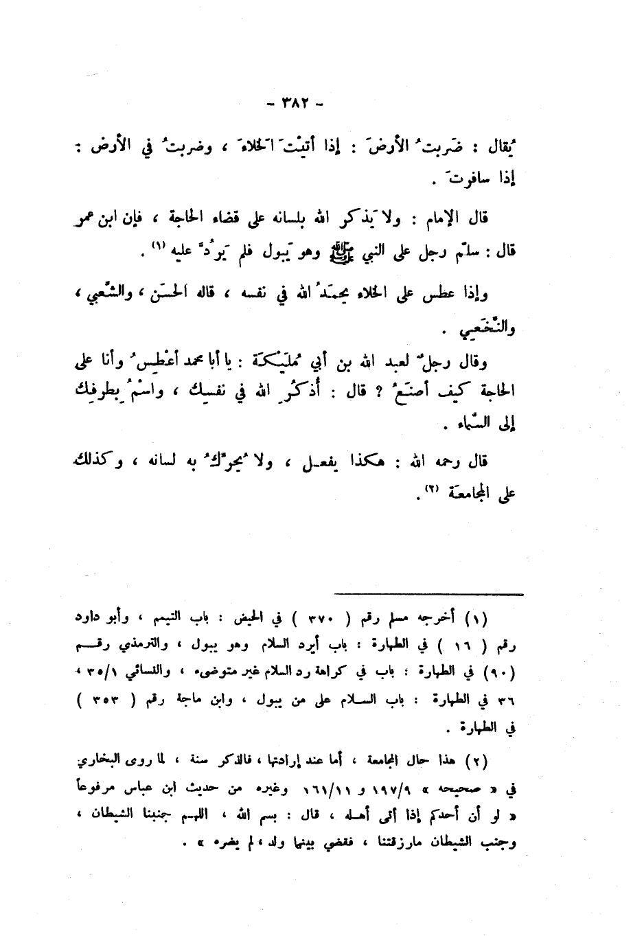 قَالَ الإِمَامُ: وَلا يَذْكُرُ اللَّهَ بِلِسَانِهِ عَلَى قَضَاءِ الْحَاجَةِ، فَإِنَّ ابْنَ عُمَرَ، قَالَ: «سَلَّمَ رَجُلٌ عَلَى النَّبِيِّ صَلَّى اللهُ عَلَيْهِ وَسَلَّمَ وَهُوَ يَبُولُ فَلَمْ يَرُدَّ عَلَيْهِ».