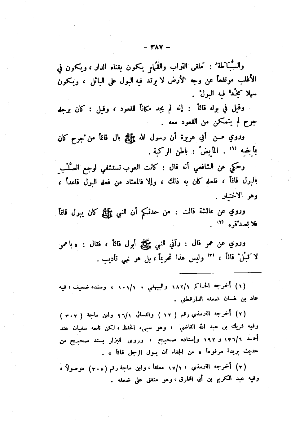 وَرُوِيَ عَنْ عُمَرَ، قَالَ: رَآنِي النَّبِيُّ صَلَّى اللهُ عَلَيْهِ وَسَلَّمَ أَبُولُ قَائِمًا، فَقَالَ: «يَا عُمَرُ، لَا تَبُلْ قَائِمًا» وَلَيْسَ هَذَا تَحْرِيمًا، بَلْ هُوَ نَهْيُ تَأْدِيبٍ.
