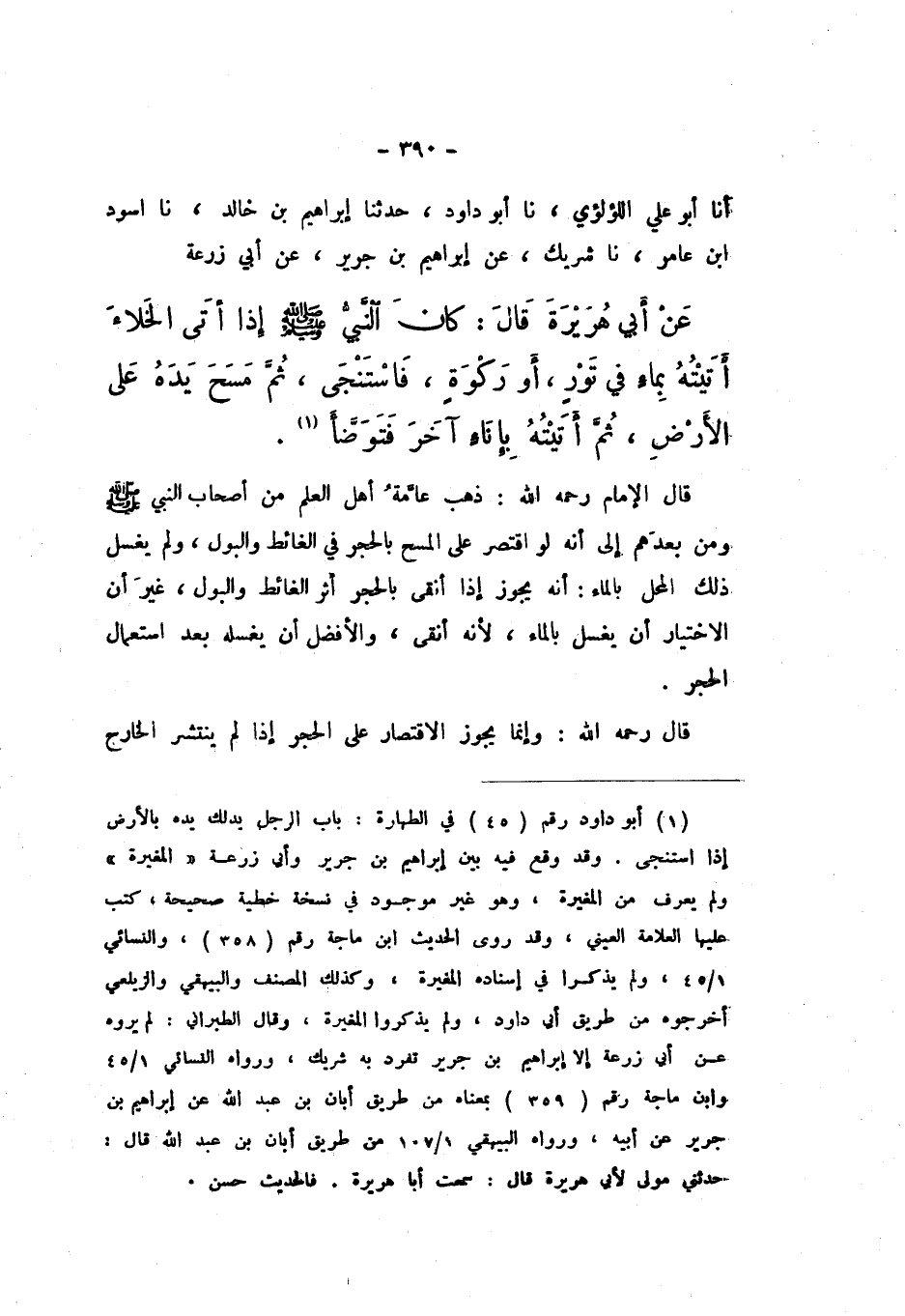 قَالَ الإِمَامُ، رَحِمَهُ اللَّهُ: ذَهَبَ عَامَّةُ أَهْلِ الْعِلْمِ مِنْ أَصْحَابِ النَّبِيِّ صَلَّى اللهُ عَلَيْهِ وَسَلَّمَ، وَمَنْ بَعْدَهُمْ إِلَى أَنَّهُ لَوِ اقْتَصَرَ عَلَى الْمَسْحِ بِالْحَجَرِ فِي الْغَائِطِ وَالْبَوْلِ، وَلَمْ يَغْسِلْ ذَلِكَ الْمَحَلُّ بِالْمَاءِ أَنَّهُ يَجُوزُ إِذَا أَنْقَى بِالْحَجَرِ أَثَرَ الْغَائِطِ وَالْبَوْلِ، غَيْرَ أَنَّ الاخْتِيَارَ أَنْ يَغْسِلَ بِالْمَاءِ، لأَنَّهُ أَنْقَى، وَالأَفْضَلُ أَنْ يَغْسِلَهُ بَعْدَ اسْتِعْمَالِ الْحَجَرِ.