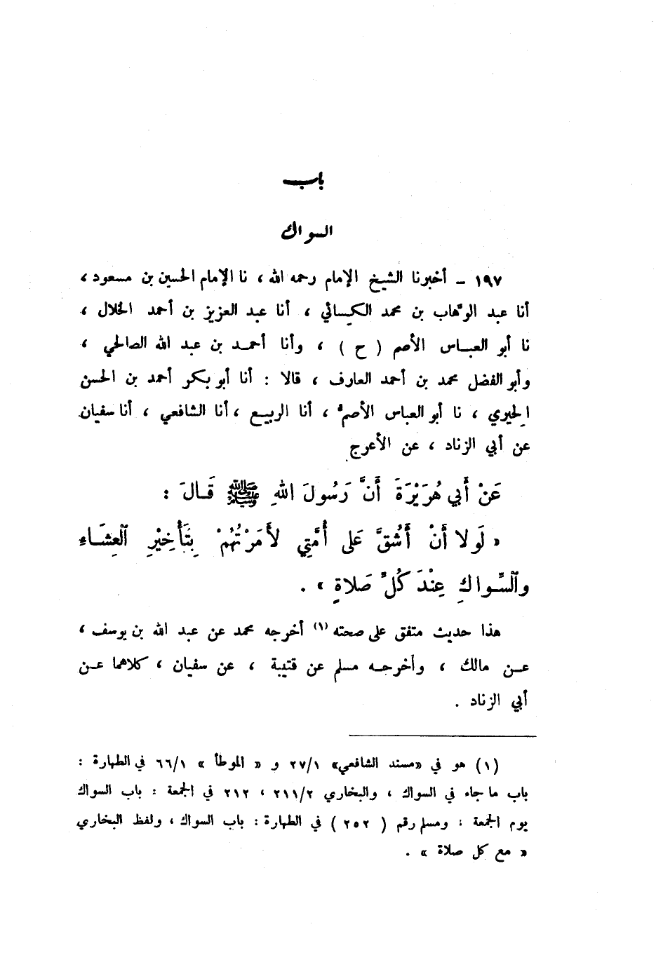 ح أَنا أَحْمَدُ بْنُ عَبْدِ اللَّهِ الصَّالِحِيُّ، وَأَبُو الْفَضْلِ مُحَمَّدُ بْنُ أَحْمَدَ الْعَارِفُ، قَالا: أَنا أَبُو بَكْرٍ أَحْمَدُ بْنُ الْحَسَنِ الْحِيرِيُّ، نَا أَبُو الْعَبَّاسِ الأَصَمُّ، أَنا الرَّبِيعُ، أَنا الشَّافِعِيُّ، أَنا سُفْيَانُ، عَنْ أَبِي الزِّنَادِ، عَنِ الأَعْرَجِ، عَنْ أَبِي هُرَيْرَةَ، أَنَّ رَسُولَ اللَّهِ صَلَّى اللهُ عَلَيْهِ وَسَلَّمَ، قَالَ: «لَوْلا أَنْ أَشُقَّ عَلَى أُمَّتِي لأَمَرْتُهُمْ بِتَأْخِيرِ الْعِشَاءِ وَالسِّوَاكِ عِنْدَ كُلِّ صَلاةٍ».