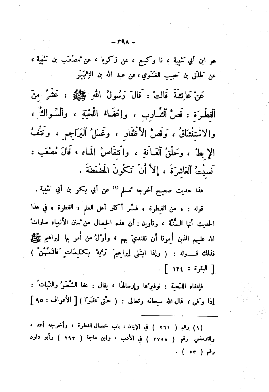 هُوَ ابْنُ أَبِي شَيْبَةَ، نَا وَكِيعٌ، عَنْ زَكَرِيَّا، عَنْ مُصْعَبِ بْنِ شَيْبَةَ، عَنْ طَلْقِ بْنِ حَبِيبٍ الْغَنَوِيِّ، عَنْ عَبْدِ اللَّهِ بْنِ الزُّبَيْرِ، عَنْ عَائِشَةَ، قَالَتْ: قَالَ رَسُولُ اللَّهِ صَلَّى اللهُ عَلَيْهِ وَسَلَّمَ: " عَشْرٌ مِنَ الْفِطْرَةِ: قَصُّ الشَّارِبِ، وَإِعْفَاءُ اللِّحْيَةِ، وَالسِّوَاكُ، وَالاسْتِنْشَاقُ، وَقَصُّ الأَظْفَارِ، وَغَسْلُ الْبَرَاجِمِ، وَنَتْفُ الإِبْطِ، وَحَلْقُ الْعَانَةِ، وَانْتِقَاصُ الْمَاءِ " قَالَ مُصْعَبٌ: نَسِيتُ الْعَاشِرَةَ، إِلا أَنْ تَكُونَ الْمَضْمَضَةُ.