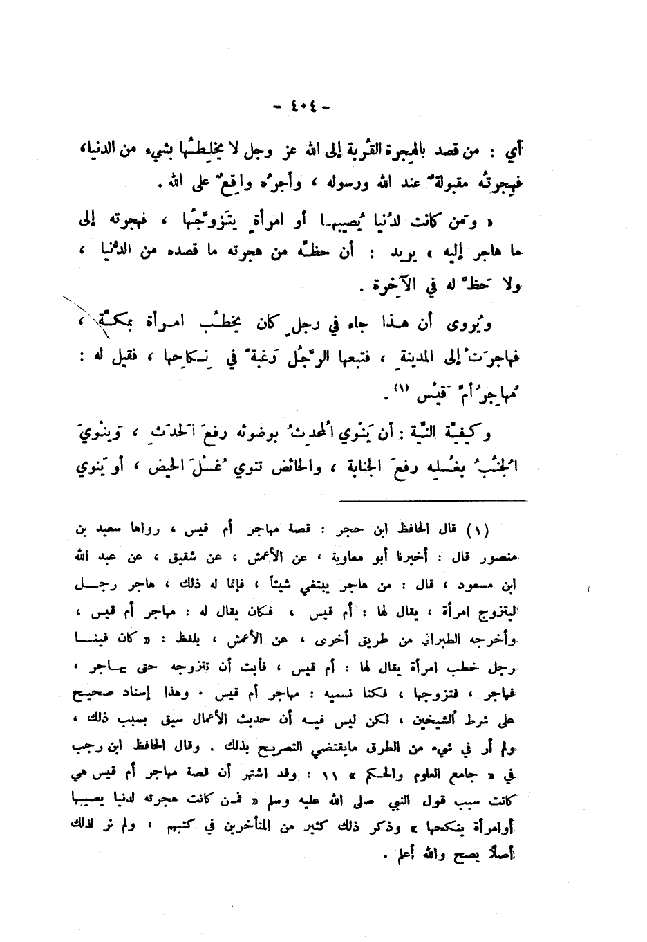 «وَمَنْ كَانَتْ هِجْرَتُهُ لِدُنْيَا يُصِيبُهَا أَوِ امْرَأَةٍ يَتَزَوَّجُهَا، فَهِجْرَتُهُ إِلَى مَا هَاجَرَ إِلَيْهِ» يُرِيدُ: أَنَّ حَظَّهُ مِنْ هِجْرَتِهِ مَا قَصَدَهُ مِنَ الدُّنْيَا، وَلا حَظَّ لَهُ فِي الآخِرَةِ.