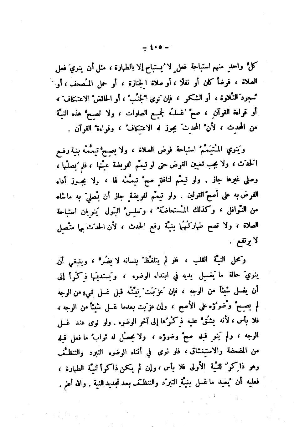 كُلُّ وَاحِدٍ مِنْهُمُ اسْتِبَاحَةَ فِعْلٍ لَا يُسْتَبَاحُ إِلا بِالطَّهَارَةِ، مِثْلُ أَنْ يَنْوِيَ فِعْلَ الصَّلاةِ، فَرْضًا كَانَ أَوْ نَفْلا، أَوْ صَلاةَ الْجِنَازَةِ، أَوْ حَمْلَ الْمُصْحَفِ، أَوْ سُجُودَ التِّلاوَةِ أَوِ الشُّكْرِ، فَإِنْ نَوَى الْجُنُبُ، أَوِ الْحَائِضُ، الاعْتِكَافَ، أَوْ قِرَاءَةَ الْقُرْآنِ، صَحَّ غُسْلُهُ لِجَمِيعِ الصَّلَوَاتِ، وَلا تَصِحُّ هَذِهِ النِّيَّةُ مِنَ الْمُحْدِثِ، لأَنَّ الْمُحْدِثَ يَجُوزُ لَهُ الاعْتِكَافُ وَقِرَاءَةُ الْقُرْآنِ، وَيَنْوِي الْمُتَيَمِّمُ اسْتِبَاحَةَ فَرْضِ الصَّلاةِ، وَلا يَصِحُّ تَيَمُّمُهُ بِنِيَّةِ رَفْعِ الْحَدَثِ، وَلا يَجِبُ تَعْيِينِ الْفَرْضِ حَتَّى لَوْ تَيَمَّمَ لِفَرِيضَةٍ عَيَّنَهَا، فَلَمْ يُصَلِّهَا، وَصَلَّى غَيْرَهَا جَازَ، وَلَوْ تَيَمَّمَ لِنَافِلَةٍ صَحَّ تَيَمُّمُهُ لَهَا، وَلا يَجُوزُ أَدَاءُ الْفَرْضِ بِهِ عَلَى أَصَحِّ الْقَوْلَيْنِ، وَلَوْ تَيَمَّمَ لِفَرِيضَةٍ جَازَ أَنْ يُصَلِّيَ بِهِ مَا شَاءَ مِنَ النَّوَافِلِ، وَكَذَلِكَ الْمُسْتَحَاضَةُ، وَسَلِسُ الْبَوْلِ يَنْوِيَانِ اسْتِبَاحَةَ الصَّلاةِ، وَلا تَصِحُّ طَهَارَتُهُمَا بِنِيَّةِ رَفْعِ الْحَدَثِ، لأَنَّ الْحَدَثَ بِهِمَا مُتَّصِلٌ لَا يَرْتَفِعُ.