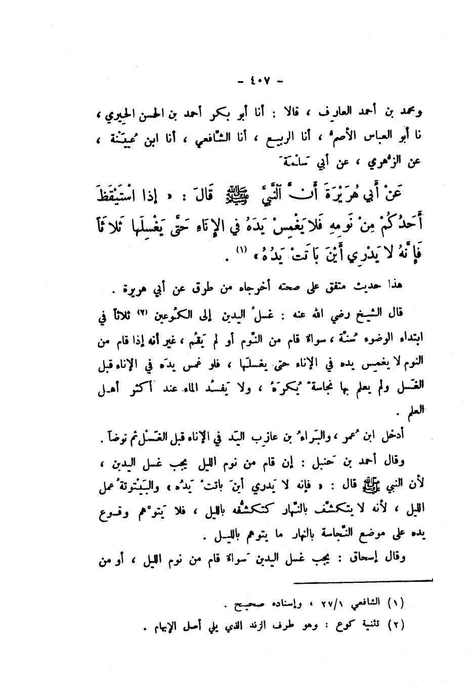 وَمُحَمَّدُ بْنُ أَحْمَدَ الْعَارِفُ، قَالا، أَنا أَبُو بَكْرٍ أَحْمَدُ بْنُ الْحَسَنِ الْحِيرِيُّ، نَا أَبُو الْعَبَّاسِ الأَصَمُّ، أَنا الرَّبِيعُ، أَنا الشَّافِعِيُّ، أَنا ابْنُ عُيَيْنَةَ، عَنِ الزُّهْرِيِّ، عَنْ أَبِي سَلَمَةَ، عَنْ أَبِي هُرَيْرَةَ، أَنَّ النَّبِيَّ صَلَّى اللهُ عَلَيْهِ وَسَلَّمَ، قَالَ: «إِذَا اسْتَيْقَظَ أَحَدُكُمْ مِنْ نَوْمِهِ فَلا يَغْمِسْ يَدَهُ فِي الإِنَاءِ حَتَّى يَغْسِلَهَا ثَلاثًا، فَإِنَّهُ لَا يَدْرِي أَيْنَ بَاتَتْ يَدُهُ».