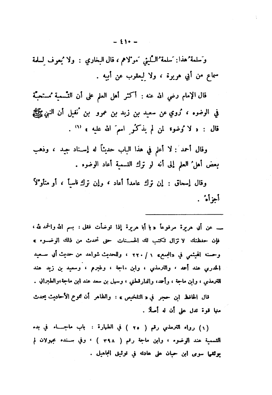 قَالَ الإِمَامُ رَضِيَ اللَّهُ عَنْهُ: أَكْثَرُ أَهْلِ الْعِلْمِ عَلَى أَنَّ التَّسْمِيَةَ مُسْتَحَبَّةٌ فِي الْوُضُوءِ، رُوِيَ عَنْ سَعِيدِ بْنِ زَيْدِ بْنِ عَمْرِو بْنِ نُفَيْلٍ أَنَّ النَّبِيَّ صَلَّى اللهُ عَلَيْهِ وَسَلَّمَ، قَالَ: «لَا وُضُوءَ لِمَنْ لَمْ يَذْكُرِ اسْمَ اللَّهِ عَلَيْهِ».