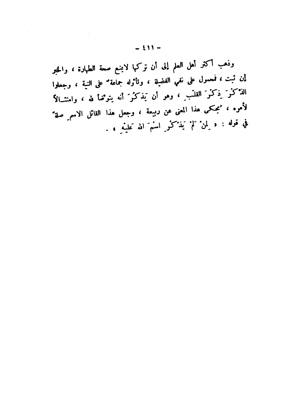 وَذَهَبَ أَكْثَرُ أَهْلِ الْعِلْمِ إِلَى أَنَّ تَرْكَهَا لَا يَمْنَعُ صِحَّةَ الطَّهَارَةِ، وَالْخَبَرُ إِنْ ثَبَتَ، فَمَحْمُولٌ عَلَى نَفْيِ الْفَضِيلَةِ، وَتَأَوَّلَهُ جَمَاعَةٌ عَلَى النِّيَّةِ، وَجَعَلُوا الذِّكْرَ ذِكْرَ الْقَلْبِ، وَهُوَ أَنْ يَذْكُرَ أَنَّهُ يَتَوَضَّأُ لِلَّهِ، وَامْتِثَالا لأَمْرِهِ، يُحْكَى هَذَا الْمَعْنَى عَنْ رَبِيعَةَ، وَجَعَلَ هَذَا الْقَائِلُ الاسْمَ صِلَةً فِي قَوْلِهِ: «لِمَنْ لَمْ يَذْكُرِ اسْمَ اللَّهِ عَلَيْهِ».