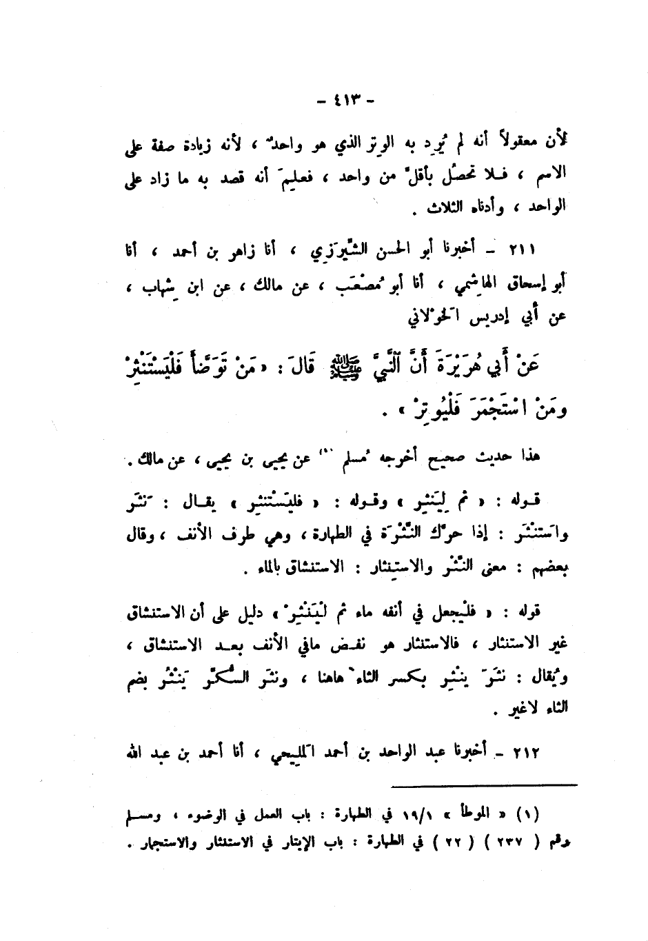 211 - أَخْبَرَنَا أَبُو الْحَسَنِ الشِّيرَزِيُّ، أَنا زَاهِرُ بْنُ أَحْمَدَ، أَنا أَبُو إِسْحَاقَ الْهَاشِمِيُّ، أَنا أَبُو مُصْعَبٍ، عَنْ مَالِكٍ، عَنِ ابْنِ شِهَابٍ، عَنْ أَبِي إِدْرِيسَ الْخَوْلانِيِّ، عَنْ أَبِي هُرَيْرَةَ، أَنَّ النَّبِيَّ صَلَّى اللهُ عَلَيْهِ وَسَلَّمَ، قَالَ: «مَنْ تَوَضَّأَ فَلْيَسْتَنْثِرْ، وَمَنِ اسْتَجْمَرَ فَلْيُوتِرْ».