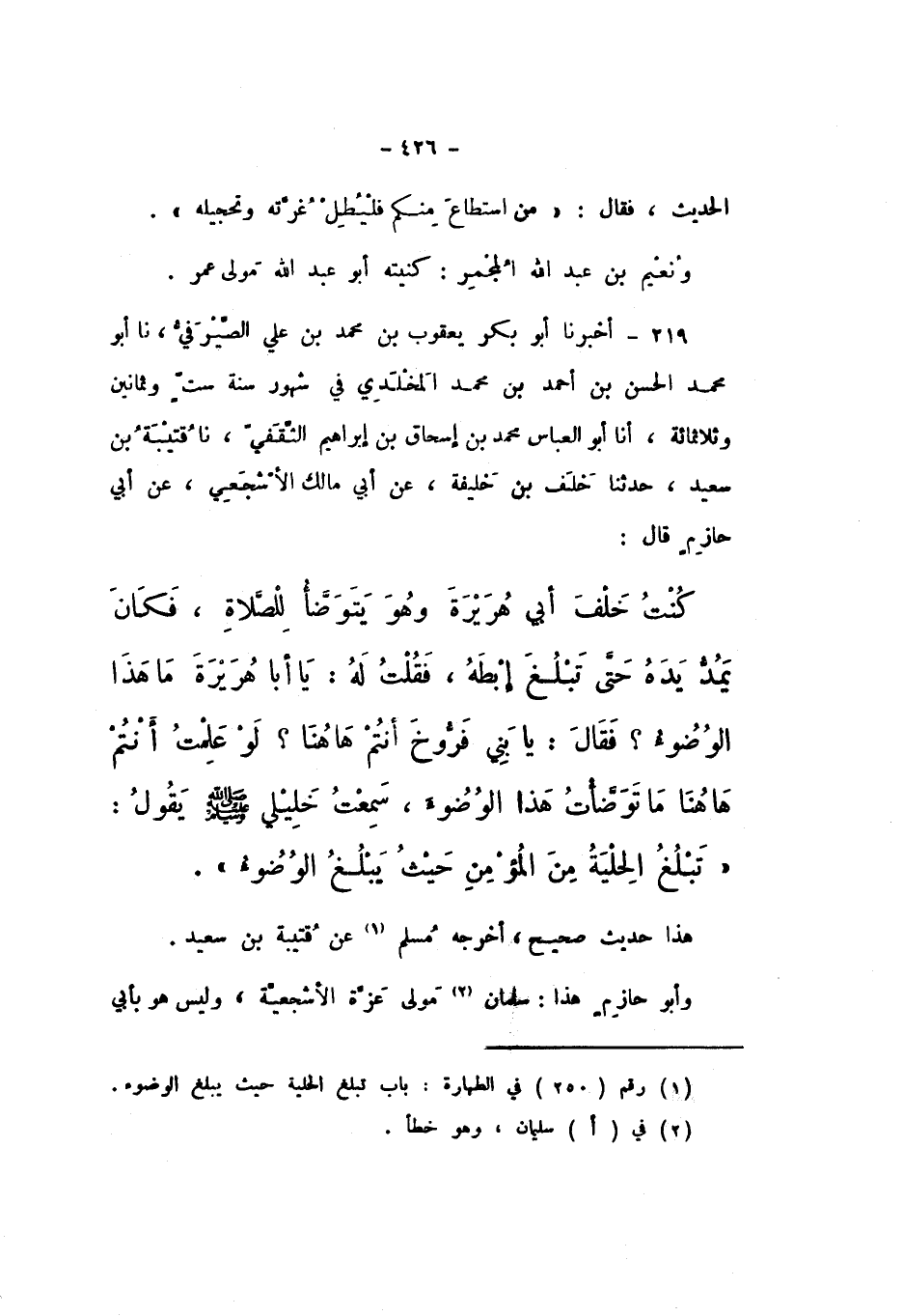 219 - أَخْبَرَنَا أَبُو بَكْرٍ يَعْقُوبُ بْنُ مُحَمَّدِ بْنِ عَلِيٍّ الصَّيْرَفِيُّ، نَا أَبُو مُحَمَّدٍ الْحَسَنُ بْنُ أَحْمَدَ بْنِ مُحَمَّدٍ الْمَخْلَدِيُّ، فِي شُهُورٍ سَنَةَ سِتٍّ وَثَمَانِينَ وَثَلاثِ مِائَةٍ، أَنا أَبُو الْعَبَّاسِ مُحَمَّدُ بْنُ إِسْحَاقَ بْنِ إِبْرَاهِيمَ الثَّقَفِيُّ، نَا قُتَيْبَةُ بْنُ سَعِيدٍ، حَدَّثَنَا خَلَفُ بْنُ خَلِيفَةَ، عَنْ أَبِي مَالِكٍ الأَشْجَعِيِّ، عَنْ أَبِي حَازِمٍ، قَالَ: كُنْتُ خَلْفَ أَبِي هُرَيْرَةَ وَهُوَ يَتَوَضَّأُ لِلصَّلاةِ، فَكَانَ يَمُدُّ يَدَهُ حَتَّى تَبْلُغَ إِبْطَهُ، فَقُلْتُ لَهُ: يَا أَبَا هُرَيْرَةَ مَا هَذَا الْوُضُوءُ؟ فَقَالَ: يَا بَنِي فَرُّوخَ، أَنْتُمْ هَهُنَا؟ لَوْ عَلِمْتُ أَنْتُمْ هَهُنَا مَا تَوَضَّأْتُ هَذَا الْوُضُوءَ، وَسَمِعْتُ خَلِيلِي صَلَّى اللهُ عَلَيْهِ وَسَلَّمَ، يَقُولُ: «تَبْلُغُ الْحِلْيَةُ مِنَ الْمُؤْمِنِ حَيْثُ يَبْلُغُ الْوُضُوءُ».