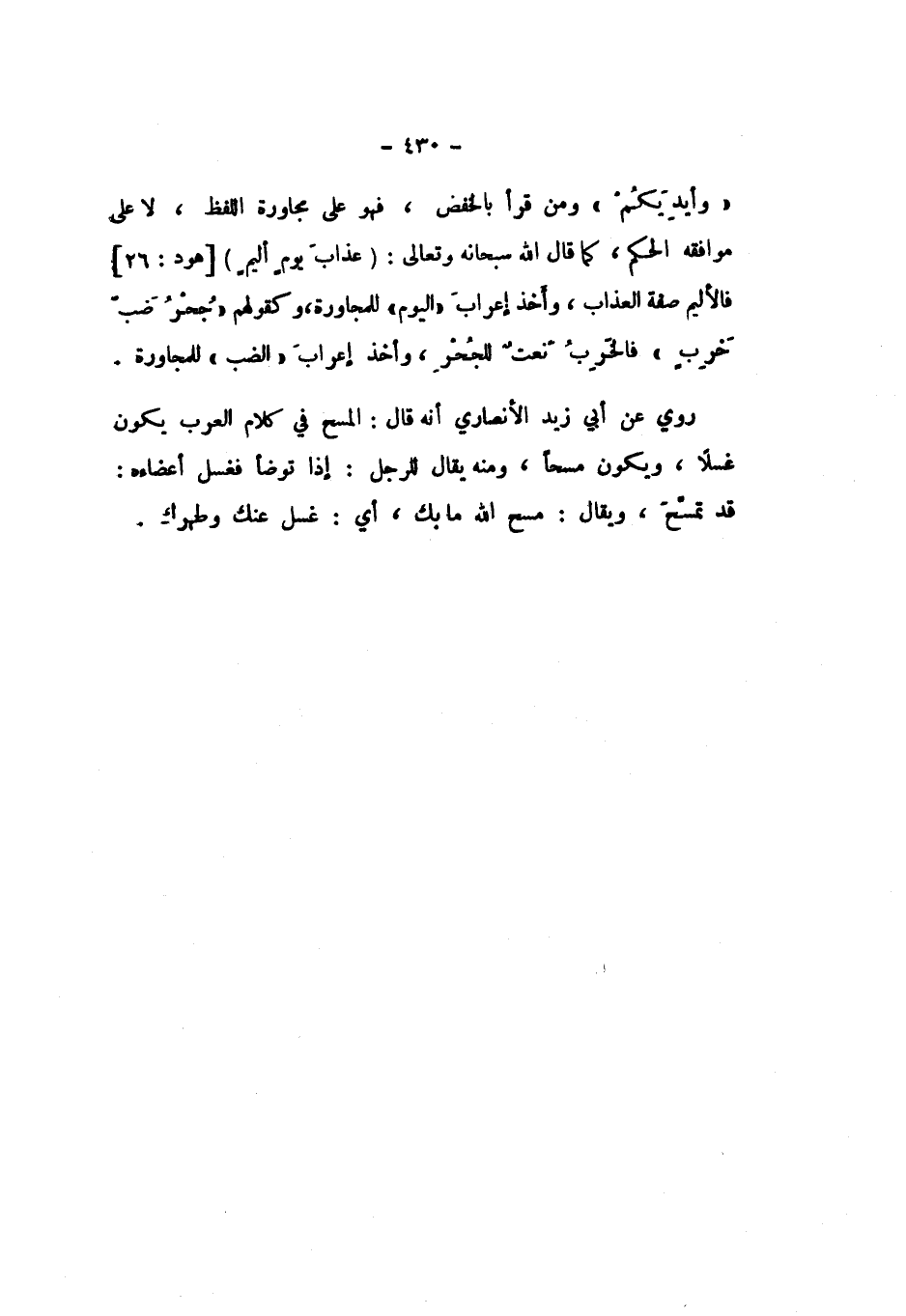 وَأَيْدِيَكُمْ} [الْمَائِدَة: 6] وَمَنْ قَرَأَ بِالْخَفْضِ، فَهُوَ عَلَى مُجَاوَرَةِ اللَّفْظِ، لَا عَلَى مُوَافَقَةِ الْحُكْمِ، كَمَا قَالَ اللَّهُ سُبْحَانَهُ وَتَعَالَى: {عَذَابَ يَوْمٍ أَلِيمٍ} [هود: 26] فَالأَلِيمُ صِفَةُ الْعَذَابِ، وَأَخَذَ إِعْرَابُ «الْيَوْمِ» لِلْمُجَاوَرَةِ، وَكَقَوْلِهِمْ: «حُجْرُ ضَبٍّ خَرِبٍ».
