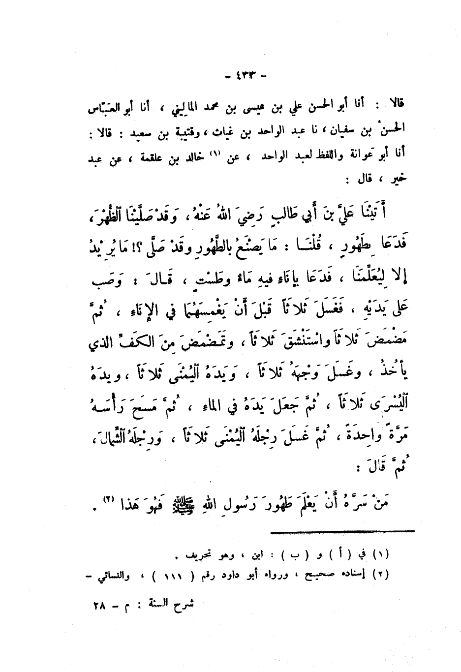 قَالا: أَنا أَبُو الْحَسَنِ عَلِيُّ بْنُ عِيسَى بْنِ مُحَمَّدٍ الْمَالِينِيُّ أَنا أَبُو الْعَبَّاسِ الْحَسَنُ بْنُ سُفْيَانَ، نَا عَبْدُ الْوَاحِدِ بْنُ غِيَاثٍ، وَقُتَيْبَةُ بْنُ سَعِيدٍ، قَالا: أَنا أَبُو عَوَانَةَ، وَاللَّفْظُ لِعَبْدِ الْوَاحِدِ، عَنْ خَالِدِ بْنِ عَلْقَمَةَ، عَنْ عَبْدِ خَيْرٍ، قَالَ: " أَتَيْنَا عَلِيَّ بْنَ أَبِي طَالِبٍ رَضِيَ اللَّهُ عَنْهُ، وَقَدْ صَلَّيْنَا الظُّهْرَ، فَدَعَا بِطَهُورٍ، قُلْنَا: مَا يَصْنَعُ بِالطَّهُورِ وَقَدْ صَلَّى؟ مَا يُرِيدُ إِلا لِيُعَلِّمَنَا، فَدَعَا بِإِنَاءٍ فِيهِ مَاءٌ وَطَسْتٍ، قَالَ: وَصَبَّ عَلَى يَدَيْهِ، فَغَسَلَ ثَلاثًا قَبْلَ أَنْ يَغْمِسَهُمَا فِي الإِنَاءِ، ثُمَّ مَضْمَضَ ثَلاثًا، وَاسْتَنْشَقَ ثَلاثًا، وَتَمَضْمَضَ مِنَ الْكَفِّ الَّذِي يَأْخُذُ، وَغَسَلَ وَجْهَهُ ثَلاثًا، وَيَدَهُ الْيُمْنَى ثَلاثًا، وَيَدَهُ الْيُسْرَى ثَلاثًا، ثُمَّ جَعَلَ يَدَهُ فِي الْمَاءِ، ثُمَّ مَسَحَ رَأْسَهُ مَرَّةً وَاحِدَةً، ثُمَّ غَسَلَ رِجْلَهُ الْيُمْنَى ثَلاثًا وَرِجْلَهُ الشِّمَالَ، ثُمَّ قَالَ: مَنْ سَرَّهُ أَنْ يَعْلَمَ طَهُورَ رَسُولِ اللَّهِ صَلَّى اللهُ عَلَيْهِ وَسَلَّمَ، فَهُوَ هَذَا ".
