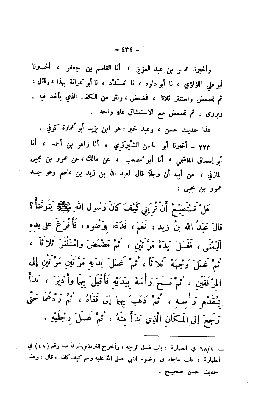 223 - أَخْبَرَنَا أَبُو الْحَسَنِ الشِّيرَزِيُّ، أَنا زَاهِرُ بْنُ أَحْمَدَ، أَنا أَبُو إِسْحَاقَ الْهَاشِمِيُّ، أَنا أَبُو مُصْعَبٍ، عَنْ مَالِكٍ، عَنْ عَمْرِو بْنِ يَحْيَى الْمَازِنِيِّ، عَنْ أَبِيهِ، أَنَّ رَجُلا قَالَ لِعَبْدِ اللَّهِ بْنِ زَيْدِ بْنِ عَاصِمٍ وَهُوَ جَدُّ عَمْرِو بْنِ يَحْيَى " هَلْ تَسْتَطِيعُ أَنْ تُرِيَنِي كَيْفَ كَانَ رَسُولُ اللَّهِ صَلَّى اللهُ عَلَيْهِ وَسَلَّمَ يَتَوَضَّأُ؟ قَالَ عَبْدُ اللَّهِ بْنُ زَيْدٍ: نَعَمْ، فَدَعَا بِوَضُوءٍ، فَأَفْرَغَ عَلَى يَدِهِ الْيُمْنَى، فَغَسَلَ يَدَهُ مَرَّتَيْنِ، ثُمَّ مَضْمَضَ وَاسْتَنْثَرَ ثَلاثًا، ثُمَّ غَسَلَ وَجْهَهُ ثَلاثًا، ثُمَّ غَسَلَ يَدَيْهِ مَرَّتَيْنِ مَرَّتَيْنِ إِلَى الْمِرْفَقَيْنِ، ثُمَّ مَسَحَ رَأْسَهُ بِيَدَيْهِ فَأَقْبَلَ بِهِمَا وَأَدْبَرَ، بَدَأَ بِمُقَدَّمِ رَأْسِهِ، ثَمَّ ذَهَبَ بِهِمَا إِلَى قَفَاهُ، ثُمَّ رَدَّهُمَا حَتَّى رَجَعَ إِلَى الْمَكَانِ الَّذِي بَدَأَ مِنْهُ، ثُمَّ غَسَلَ رِجْلَيْهِ ".