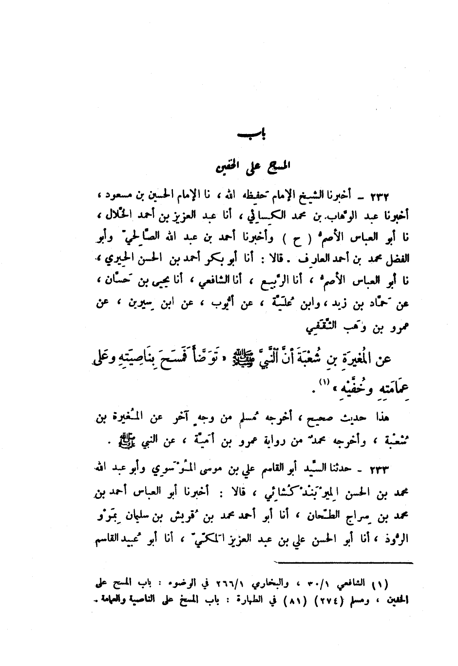 ح وَأَخْبَرَنَا أَحْمَدُ بْنُ عَبْدِ اللَّهِ الصَّالِحِيُّ، وَأَبُو الْفَضْلِ مُحَمَّدُ بْنُ أَحْمَدَ الْعَارِفُ، قَالا: أَنا أَبُو بَكْرٍ أَحْمَدُ بْنُ الْحَسَنِ الْحِيرِيُّ، نَا أَبُو الْعَبَّاسِ الأَصَمُّ، أَنا الرَّبِيعُ، أَنا الشَّافِعِيُّ، أَنا يَحْيَى بْنُ حَسَّانٍ، عَنْ حَمَّادِ بْنِ زَيْدٍ، وَابْنِ عُلَيَّةَ، عَنْ أَيُّوبَ، عَنِ ابْنِ سِيرِينَ، عَنْ عَمْرِو بْنِ وَهْبٍ الثَّقَفِيِّ، عَنِ الْمُغِيرَةِ بْنِ شُعْبَةَ، «أَنَّ النَّبِيَّ صَلَّى اللهُ عَلَيْهِ وَسَلَّمَ تَوَضَّأَ فَمَسَحَ بِنَاصِيَتِهِ، وَعَلَى عِمَامَتِهِ، وَخُفَّيْهِ».