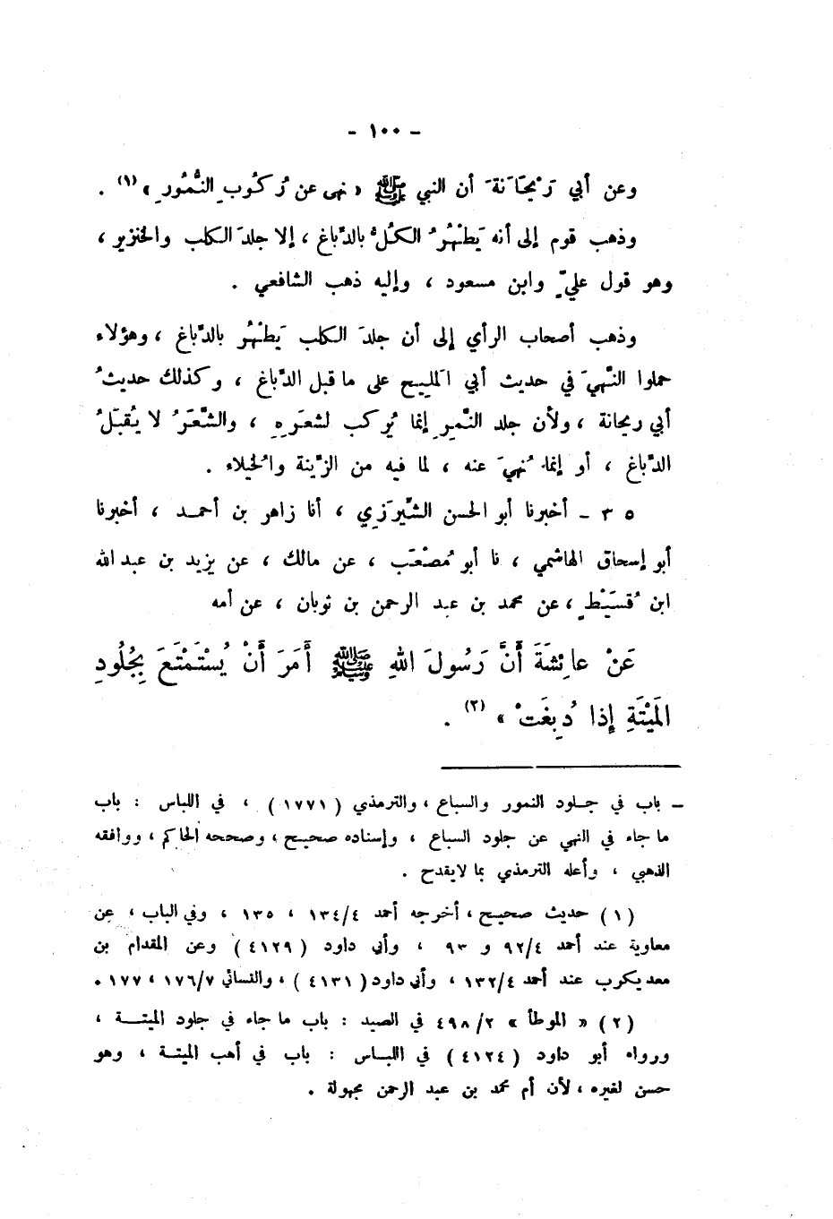 305 - أَخْبَرَنَا أَبُو الْحَسَنِ الشِّيرَزِيُّ، أَنا زَاهِرُ بْنُ أَحْمَدَ، أَنا أَبُو إِسْحَاقَ الْهَاشِمِيُّ، نَا أَبُو مُصْعَبٍ، عَنْ مَالِكٍ، عَنْ يَزِيدَ بْنِ عَبْدِ اللَّهِ بْنِ قُسَيْطٍ، عَنْ مُحَمَّدِ بْنِ عَبْدِ الرَّحْمَنِ بْنِ ثَوْبَانَ، عَنْ أُمِّهِ، عَنْ عَائِشَةَ «أَنَّ رَسُولَ اللَّهِ صَلَّى اللهُ عَلَيْهِ وَسَلَّمَ أَمَرَ أَنْ يُسْتَمْتَعَ بِجُلُودِ الْمَيْتَةِ إِذَا دُبِغَتْ»