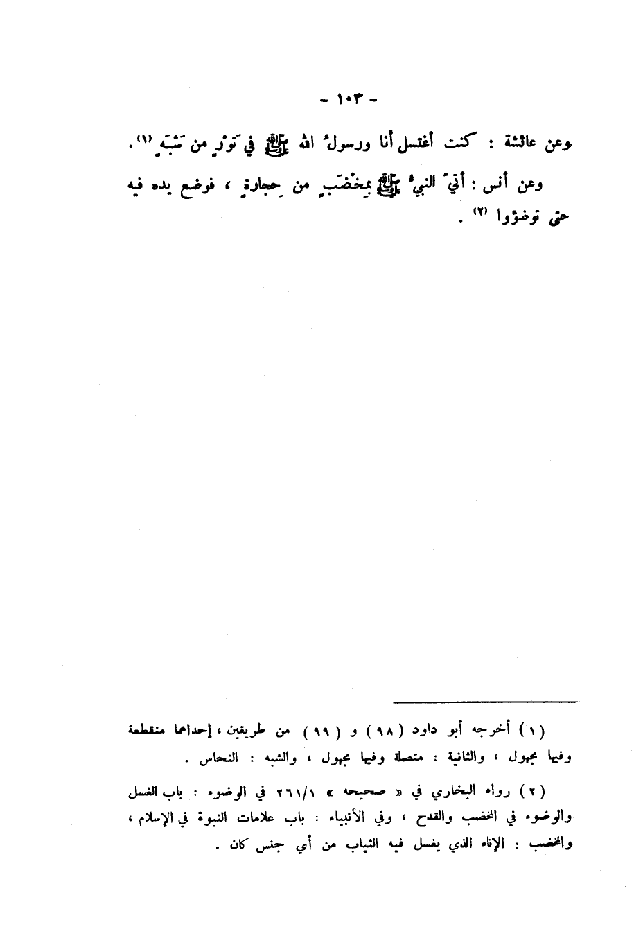 وَعَنْ أَنَسٍ: «أُتِيَ النَّبِيُّ صَلَّى اللهُ عَلَيْهِ وَسَلَّمَ بِمِخْضَبٍ مِنْ حِجَارَةٍ، فَوَضَعَ يَدَهُ فِيهِ حَتَّى تَوَضَّئُوا».