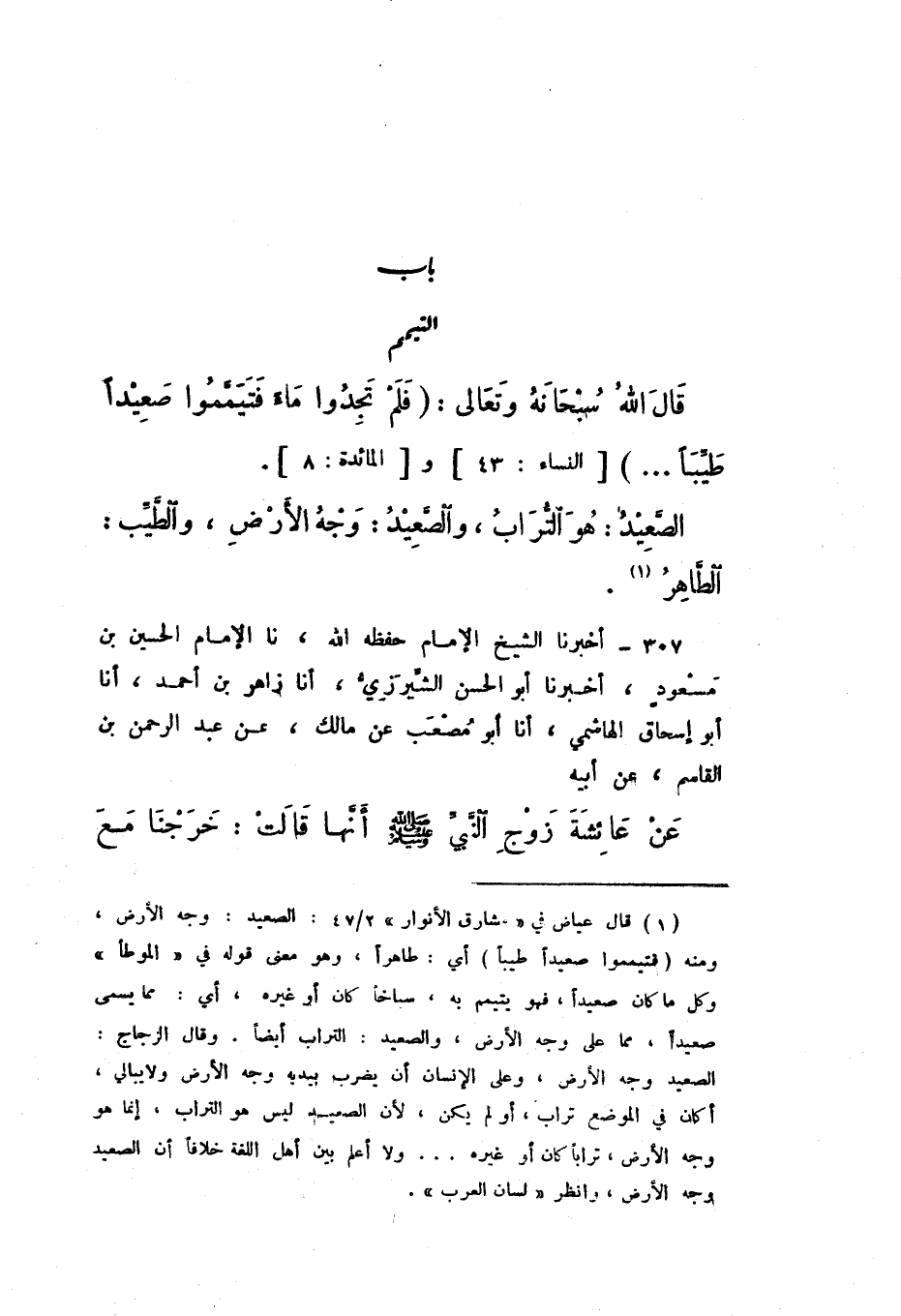 307 - أَخْبَرَنَا الشَّيْخُ الإِمَامُ، حَفِظَهُ اللَّهُ، نَا الإِمَامُ الْحُسَيْنُ بْنُ مَسْعُودٍ، أَخْبَرَنَا أَبُو الْحَسَنِ الشِّيرَزِيُّ، أَنا زَاهِرُ بْنُ أَحْمَدَ، أَنا أَبُو إِسْحَاقَ الْهَاشِمِيُّ، أَنا أَبُو مُصْعَبٍ، عَنْ مَالِكٍ، عَنْ عَبْدِ الرَّحْمَنِ بْنِ الْقَاسِمِ، عَنْ أَبِيهِ، عَنْ عَائِشَةَ زَوْجِ النَّبِيِّ صَلَّى اللهُ عَلَيْهِ وَسَلَّمَ، أَنَّهَا قَالَتْ: " خَرَجْنَا مَعَ